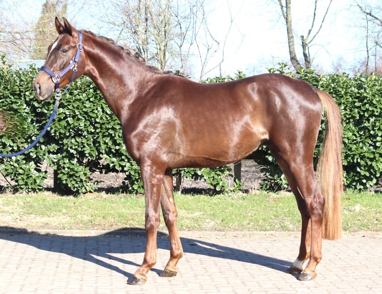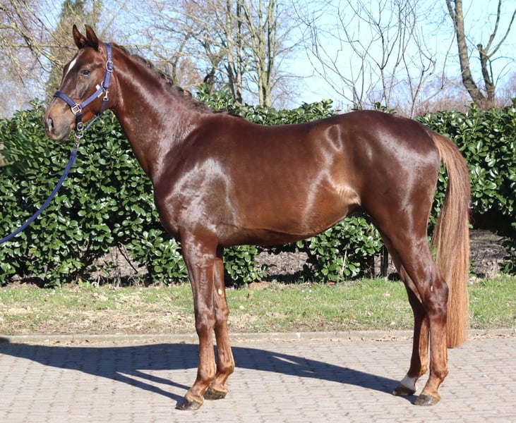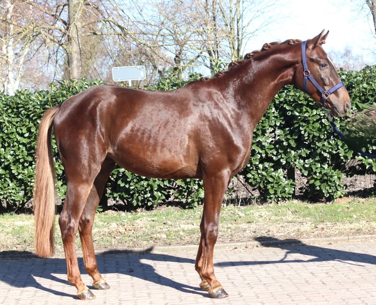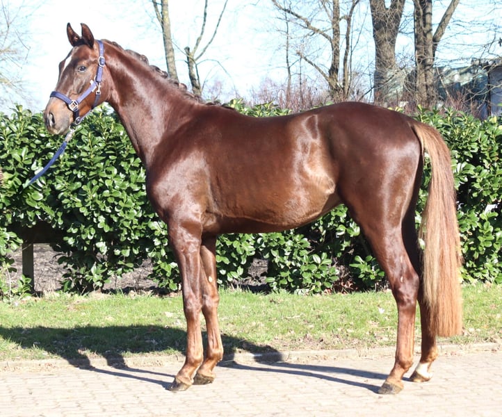 Charming 3-year-old dark chestnut gelding by Da Costa x Don Gregory, impressing with tremendous movement potential. He is well-behaved in handling but has not yet been backed. Price excluding VAT. Inquiries only by phone; emails will not be answered.