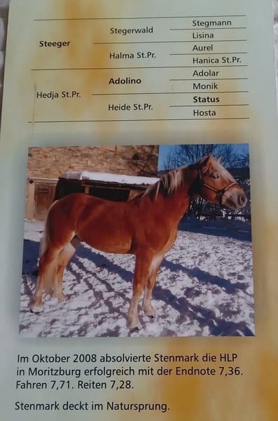 Stenmark est un étalon expressif et puissant. En pleine forme. Il a été approuvé. Agréé HLP (attelage et équitation). Il a déjà prouvé sa qualité d'héritier avec de nombreux descendants. S'accouple en monte naturelle. Enregistré en Allemagne. Conditions de saillie sur demande. Info : Les photos des flyers dans l'annonce proviennent d'une publicité antérieure 2009/ 2010.