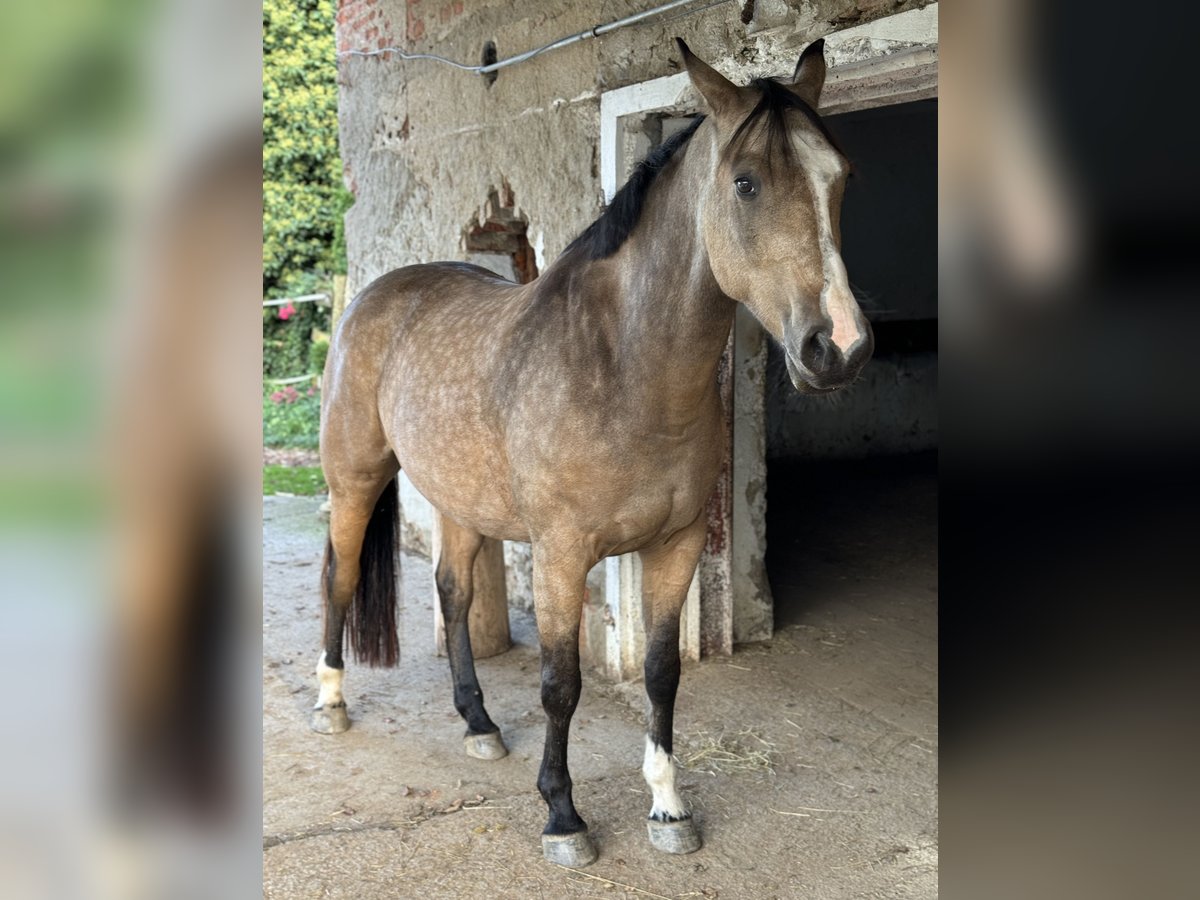 For sale: Beautiful 8-year-old warmblood gelding, buckskin, approximately 16.1 hh, registered with AES. Herd-compatible, has always been kept in an open stable, in excellent health, barefoot, never ill. Good farrier and loading manners, very well-behaved and affectionate in handling, extensively worked on the ground and in dressage, very sensitive to aids, soft in the mouth and on the bit. Easily moves away from the herd and into the terrain alone, no spooking or bolting. However, he is very confident and requires a consistent handler to guide him. If someone is unsure, he may respond with a buck. Traffic-safe, only slightly uncertain around trucks and tractors; no issues with cars, mopeds, bicycles, dogs, etc. In unfamiliar surroundings, he needs a little time to focus on his work. He also jumps very well and willingly, though he has not been actively promoted in jumping. Never shown in competitions, only a leisure horse, still very unspoiled. He is only being sold because we simply do not match. He needs the rider's confidence in the terrain, which I cannot provide due to my own nervousness. Only to a good home, no dealers. He should not become a trophy but find his place and a person who suits him, who can handle him properly and appreciates him.