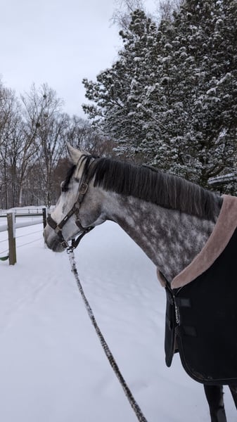 Mafamalio is a four-year-old who came directly to us from the breeder. He has placements in show jumping classes from A to M, currently multiple wins in L-level jumping and several high placements in M*. He has a lot of scope and enthusiasm for jumping and always aims for the other side. We believe he would be well-suited for a rider transitioning from pony sports or a young rider with solid foundational experience. He enjoys hacking out and is farrier- and loading-trustworthy.