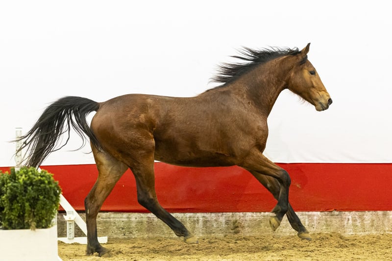 A very interesting horse with plenty of blood, light-footedness and a big heart. She shows great commitment over the fence and possesses an excellent hind leg technique. In her first jumps she already demonstrates natural scope and instinct. She is still green in everything and has not been handled extensively yet. Nevertheless, she moves easily with a strong engine from behind to in front. Her canter is balanced and gives a very pleasant, light feeling. A modern horse with quality that will develop into technically correct jumping.