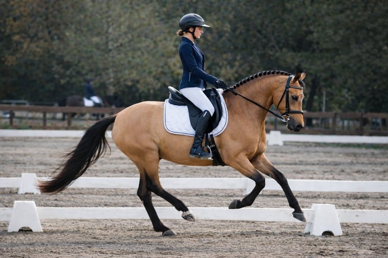We are pleased to present Championne du Coussoul, an elegant 8-year-old pony mare registered with the AES studbook. She is a cross between a German Riding Pony and a Lusitanian, making her perfect for versatile riding activities, from dressage to leisure riding. Her sire: Champion Suprême d’Été – A stallion with outstanding sporting qualities and a remarkable conformation, regularly recognized for his presence and genetics suited to dressage discipline. Her dam: Amphore du Coussoul (by Mistral du Coussoul) – A well-established maternal line known for balance, comfort, and a good mental attitude, with Lusitanian genetics passed on for finesse and a strong connection to the rider. Championne du Coussoul measures 14.8 hands, with a fine, harmonious build. She was backed in 2023 after her first foal, and has since shown steady progress under saddle, displaying a willing temperament. Very comfortable to ride, she suits both experienced riders and a caring family environment, thanks to her excellent rapport with humans. She is very affectionate, respectful, and exhibits a particularly gentle nature with children. Currently, she is working in dressage, and also trains in liberty and lunging, demonstrating great responsiveness and generosity. She lives out in the paddock, barefoot, in excellent health. She has passed veterinary examinations and radiographs without issue. She travels very well in a trailer and has already competed in events. With her exceptional mentality, comfort, and versatility, Championne du Coussoul is an ideal mare for a leisure project or guided progression, built on a strong foundation of trust.