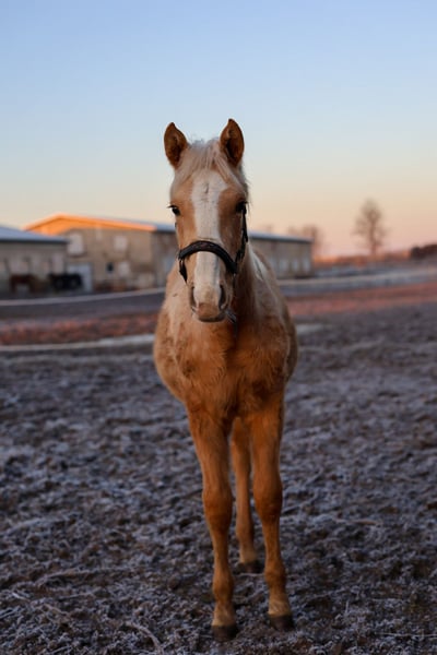 Klaczka urodzona na początku czerwca tego roku, docelowo +/- 160 cm, pełne pochodzenie po ogierze Kiss of Gold, paszport AES, nauczona chodzenia na uwiązie, przywiązana grzecznie stoi, bezproblemowa przy czyszczeniu, kowalu czy weterynarzu, szczepiona i odrobaczana, bardzo kontaktowa, chętnie idzie do człowieka, super charakter. Sprzedaż ze względu na redukcję stada :)