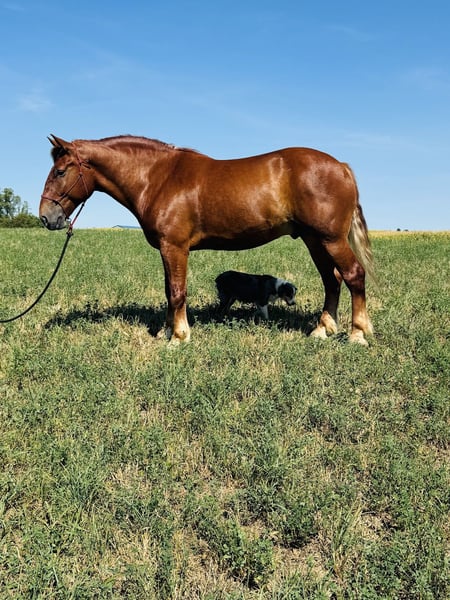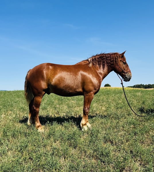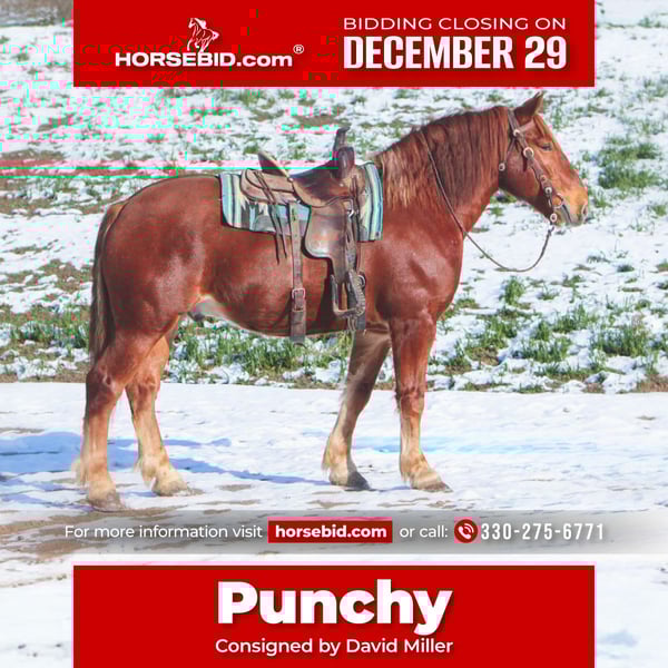 ⚜️𝐓𝐇𝐄 𝓗𝓮𝓻𝓲𝓽𝓪𝓰𝓮 𝐖𝐢𝐧𝐭𝐞𝐫 𝓒𝓵𝓪𝓼𝓼𝓲𝓬⚜️ Happening now thru MONDAY | DECEMBER 29th - Available EXCLUSIVELY on HorseBid's website! For more details and to register visit: www.Horsebid.com CONSIGNOR CONTACT: David Miller 330-275-6771 LOCATION: Millersburg, OH BREED: Suffolk Punch REGISTERED: Yes REGISTERED NAME: MILL RUN KING'S EAGLE COLOR: Red Chestnut HEIGHT: 16.2 AGE: 7 GENDER: Gelding Punchy If you are looking for a unique horse to take in any direction, whether you ride or drive, look no further than Punch! He is a 7 year old, 16.2 hand, registered Suffolk Punch gelding. He is built for comfort in the saddle as well as elegance in the harness. The Suffolk Punch breed is a British breed of draft horse known for its strength, gentle temperament, and distinctive chestnut coat. Punch is truly one of a kind. He is well broke to ride, goes on trails alone or in a group. He is confident going through water, over logs, through brush, as well as down the road. He is also remarkably broke to drive in a cart single as well as double in the team for the whole family. He would be your horse to take a nice stroll tonight, and tomorrow to take the wagon and head out on a wagon train. He also is broke to all farm machinery and knows his job. He is an “in your pocket” type horse and a barn favorite! Punch gets along with other horses and all kinds of animals. He stands well to get clipped, bathed, and for the farrier. He even hauls well in the trailer. There are just too many things to say about the great guy. Whether you want to ride or drive, this boy will do it all, and you’ll enjoy doing it all with him!