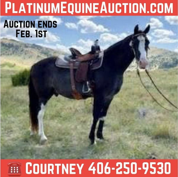 ONLINE AUCTION Place your bids at www.PlatinumEquineAuction.com Starting Bid $3500 Auction ends February 1st, 2026 Need a new saddle? Check out White Rock Saddles on our website or Facebook Ivar is a 9 year old Smokey Valley Tennessee Walking Horse gelding. He stands 15 hands high and is a gorgeous black sabino roan with plenty of chrome, natural collection and a lovely conformation. Ivar is a brilliant performance trail horse – bred for endurance and comfort. His 4-beat gait offers unrivaled smoothness and stamina. Ivar has a forward seeking nature and is incredibly responsive to light seat and leg cues. He has very solid feet, built to navigate rocky and uneven terrain and is currently rocking the barefoot look. He is well seasoned and well traveled, having covered many mountain ranges from east to west – Kentucky, Arizona, Wyoming, Montana and California – he’s truly been there, done that. Not only is this horse as smooth and pretty as they come, but he is sweet as pie. He would love nothing more than to be someone’s main ride and companion. Ivar is always willing and ready – you won’t have to catch this one in the pasture, he’ll catch you (see video!) He’s the puppy dog type and loves a good snuggle session. He’s an easy keeper, stands peacefully for the farrier and to be groomed, saddled and bathed. He’s a perfect gentleman on the ground and loads with ease like the sophisticated traveler he is. This one’s special and I could talk about him all day, feel free to call Courtney Maddux 406-250-9530 with any questions. UTD on vaccines, clean vet check on file. Sound and straight legged – PPE available at buyer’s expense. Located in Jacksboro TX, but can help arrange shipping nationwide. ONLINE AUCTION Place your bids at www.PlatinumEquineAuction.com Starting Bid $3500 Auction ends February 1st, 2026 Need a new saddle? Check out White Rock Saddles on our website or Facebook