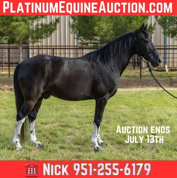 ONLINE AUCTION Place your bids at www.PlatinumEquineAuction.com Starting Bid $3500 Auction ends July 13th 2025 Need a new saddle? Check out White Rock Saddles on our website or Facebook! Bandit is a 12 year old, 14.1 hand tobiano gelding who is the ideal partner for trail and pleasure riding. Exceptionally gentle and easygoing, he’s what we like to call “beer broke” unbothered by distractions and solid in any situation. Whether you’re an experienced rider or looking for a safe mount for the family, Bandit is truly a horse for all ages even grandma! He’s the same horse every time you saddle up, whether he’s ridden daily or after a couple of months off. He has no buck, bite, or bolt, making him a reliable and trustworthy companion. Bandit is easy to haul, he loads like a pro and stands quietly for the farrier and baths. With his striking looks and honest temperament, Bandit is the total package. We’ve yet to find a flaw in him. Located in Weatherford, TX. For more information, please call or text Nick Kontoes 951-255-6179. ONLINE AUCTION Place your bids at www.PlatinumEquineAuction.com Starting Bid $3500 Auction ends July 13th 2025 Need a new saddle? Check out White Rock Saddles on our website or Facebook!