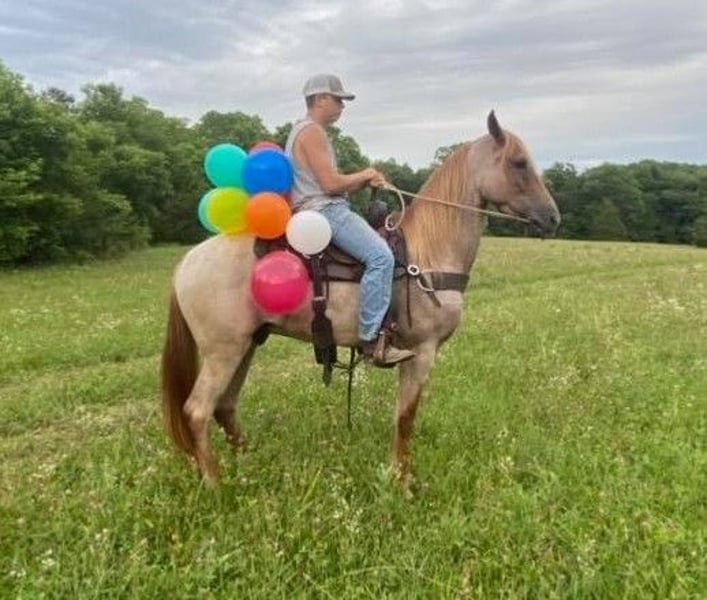 Redington Steel aka Steele Man is a 4yr old registered red roan gelding that stands 15.1hh. I cannot say enough good things about this guy. Steele man has been ridden many miles in the Big South Fork, as well as the beaches of Florida. For a 4 year old horse, he has been put through the obstacles, on overnight camping trips and is willing to please. This nice young gelding is suitable for almost any level rider. He will walk on a loose rein all day, or step up and ride when asked. He has no problem riding out alone or in large groups. Steele Man will carry your saddle bags, chain saw, or anything you need and still ride just the same. He is focused on one thing, and that’s his job. He isn’t gun shy, and as you can see from the video is not shy from loud noises or tarps. We have threw firecrackers, and other large fireworks off of Steele Man, and he did nothing but a small flinch as shown. ATVS, Motorcycles, and other farm equipment do not bother him. Steele man is the kind of guy you can take out an enjoy all day, or throw your non horse friends on and not have to worry about. He has no problem crossing creeks, steep hills or large ditches. He is a gentleman for mount and dismount, and will stand until asked to step off. He stands to be bathed, clipped and for the farrier. Steele Man has all the looks, color and brains you could ask for, all wrapped up in a young horse to last a lifetime