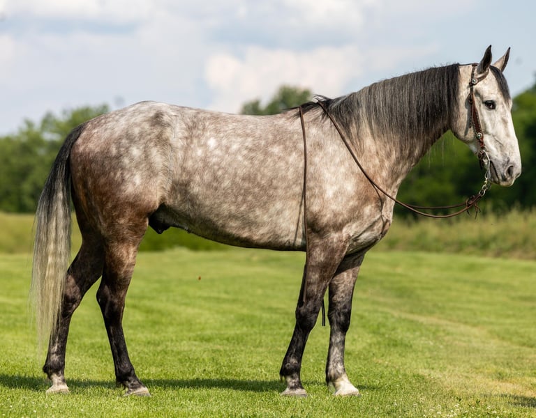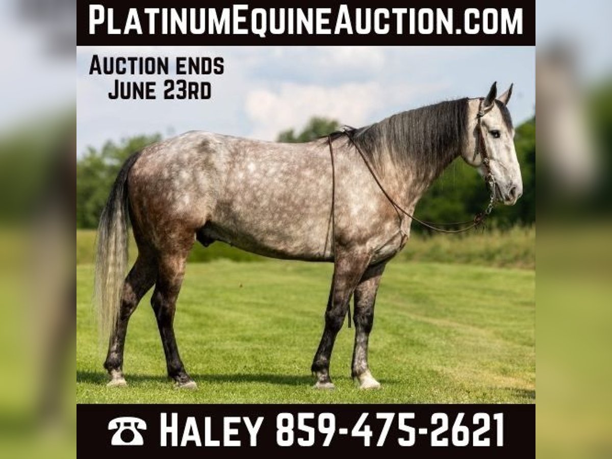 ONLINE AUCTION Place your bids at www.PlatinumEquineAuction.com Starting Bid $3500 Auction ends June 23rd, 2024 Need a new saddle? Check out White Rock Saddles on our website or Facebook! If you are looking for a trail horse on Saturday and then a horse to put on the rail Saturday night to win you some blue ribbons, look no further! Let me introduce you to Nelly. Nelly is a 6 year old DAPPLED GREY gelding. He stands 15.3 hands tall and will weigh 1100 lbs. Nelly has been used on the trails and in the show ring. He has a beautiful head set and will move out with a lot of action and style! Through the trails, Nelly will cross all obstacles with confidence rather that be trees, stumps, hills or water when asked. He is brave, sure footed and confident. He has been ridden in local fun shows and leaving with many blue ribbons! Nelly is a very personable horse! He will meet you at the gate every time! He is very gentle and doesn’t have a mean bone in his body! He stands to be saddled, bridled and groomed! He will park out on command with a tap on his shoulder! Stands for mounting and dismounting with or without a mounting block! If you’re wanting a lot of complements on the trail or a bunch of ribbons to hang on the wall, Nelly is your winner! For any other information please contact PR Quality Horses Colton 606-748-9009 or Haley 859-475-2621. ONLINE AUCTION Place your bids at www.PlatinumEquineAuction.com Starting Bid $3500 Auction ends June 23rd, 2024 Need a new saddle? Check out White Rock Saddles on our website or Facebook!