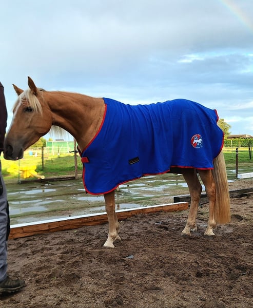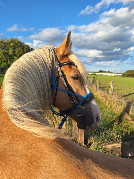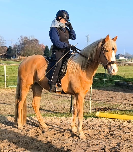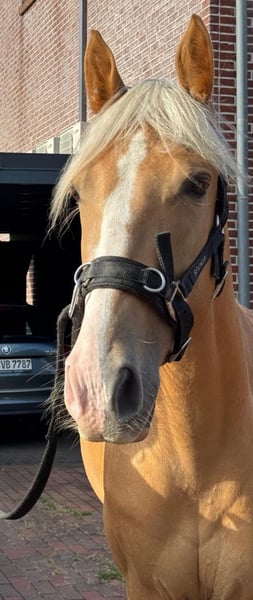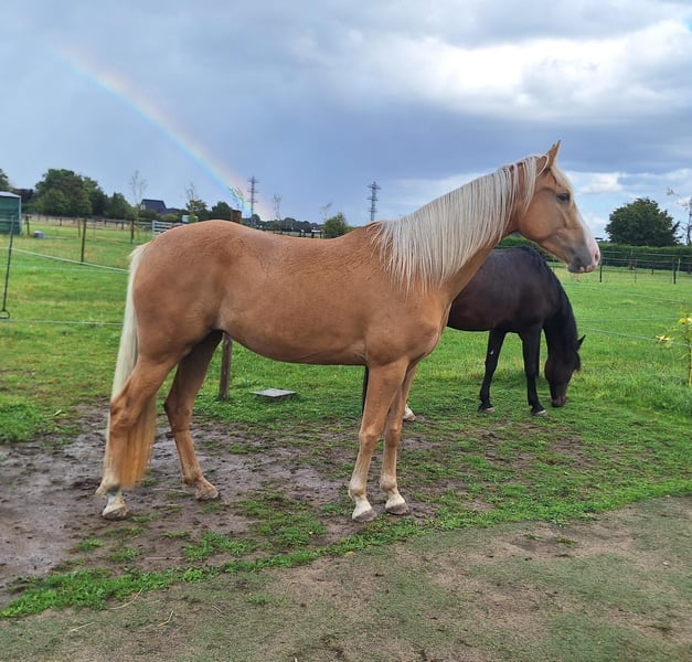 Royal Touch Of Gold aka „April“, ist eine 4-jährige, wunderschöne Palomino Stute. Ihr Pedigree spricht für sich. Ihr Vater ist Double Springs Label, der von Royal Label (Multi World Grand Champion) abstammt. Sie ist derzeit ca. 154cm und noch im Wachstum und besticht durch ein solides Fundament! Im Freilauf zeigt April einen schönen Flat Walk mit einem überzeugenden Overstride, sowie Running Walk. Sie hat dabei das typische Kopfnicken eines Tennessee Walking Horse. Ihre Lieblingsgangart ist ein wunderschöner Schaukelstuhl-Galopp. Diesen Canter beherrscht sie in allen Varianten. Von sehr langsam bis höheres Tempo. Für Gangpferdefreunde, die offen für alle Rassen sind und auf eine solide Gangveranlagung schauen, werden mit ihr ebenfalls ihr Glück finden. Je nach Vorlieben, kann die Veranlagung (auch Tölt) gefördert und ausgebildet werden. Ein Rohdiamant. Z.Bsp. kann ich sie mir sehr gut als viergängig (mit Tölt) gerittenes Pferd in Prüfungen vorstellen, wie z.B. in der Mehrgang-, Viergangprüfung, Pleasure, Gaited Working Equitation, Trail… und durch ihre selbstbewusste und unerschrockene Art, natürlich auch als Luxus Freizeit- und Geländepferd. Ihre Welt durfte sie als Handpferd kennenlernen (s. Videos). Um in den Wald zu kommen, ist es für uns normal die Pferde zu verladen und zu fahren. Auch das lernte April früh und selbstverständlich kennen. Durch Spaziergänge durch den Ort ist ihr der Straßenverkehr bekannt, wie auch andere Umweltreize, die damit einhergehen (Schulbus, Radfahrer, Baustellen, Trecker, Unterführungen usw..). Auch Spaziergänge ohne pferdische Begleitung macht sie gut. An Auswärts-Veranstaltungen hat April bereits teilgenommen, wie zB. Outdoor-Trail und Indoor-Trail, sowie an einigen Bodenarbeitskursen. Anhänger fahren und in einer fremden Umgebung auszusteigen, in einem fremden Paddock zu verweilen, macht sie gut. Fremden Pferden und neuen Dingen ist sie aufgeschlossen. Sie ist selbstbewusst und nervenstark. Ein feinfühliges Pferd, das auf kleinste Signale reagiert und einem Jungpferde erfahrenen Menschen viel Freude bereitet. Sie kennt Sattel und Trense und läuft erste Strecken mit Reitergewicht. All das macht sie gut mit (bei weiterer Ausbildung steigt der Preis). Sie ist lieb beim Impfen und beim Schmied, lässt sich gern im Sommer waschen und abspritzen... Sie lebt in einer gemischten Herde, worin sie sich in der mittleren Rangfolge befindet. Sie ist geimpft und wurde regelmäßig entwurmt. Zu ihr gehören TWHBEA Papiere, sowie einen Equidenpass. Wegen ihrer guten Abstammung und ihrer wunderschönen Farbe (sie besitzt mindestens ein Cremegen), ist sie auch für die Zucht interessant. Wir wünschen uns erfahrene Pferdemenschen, die Freude daran haben, ein junges Gangpferd weiter auszubilden.