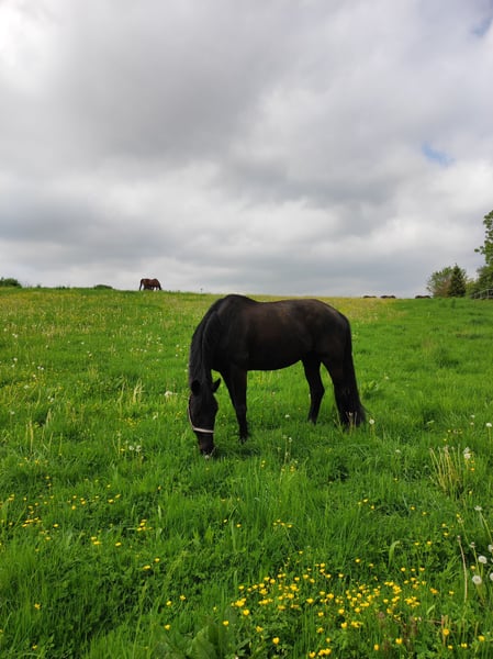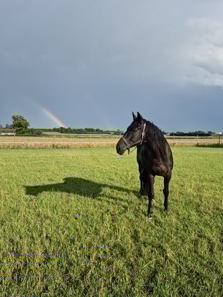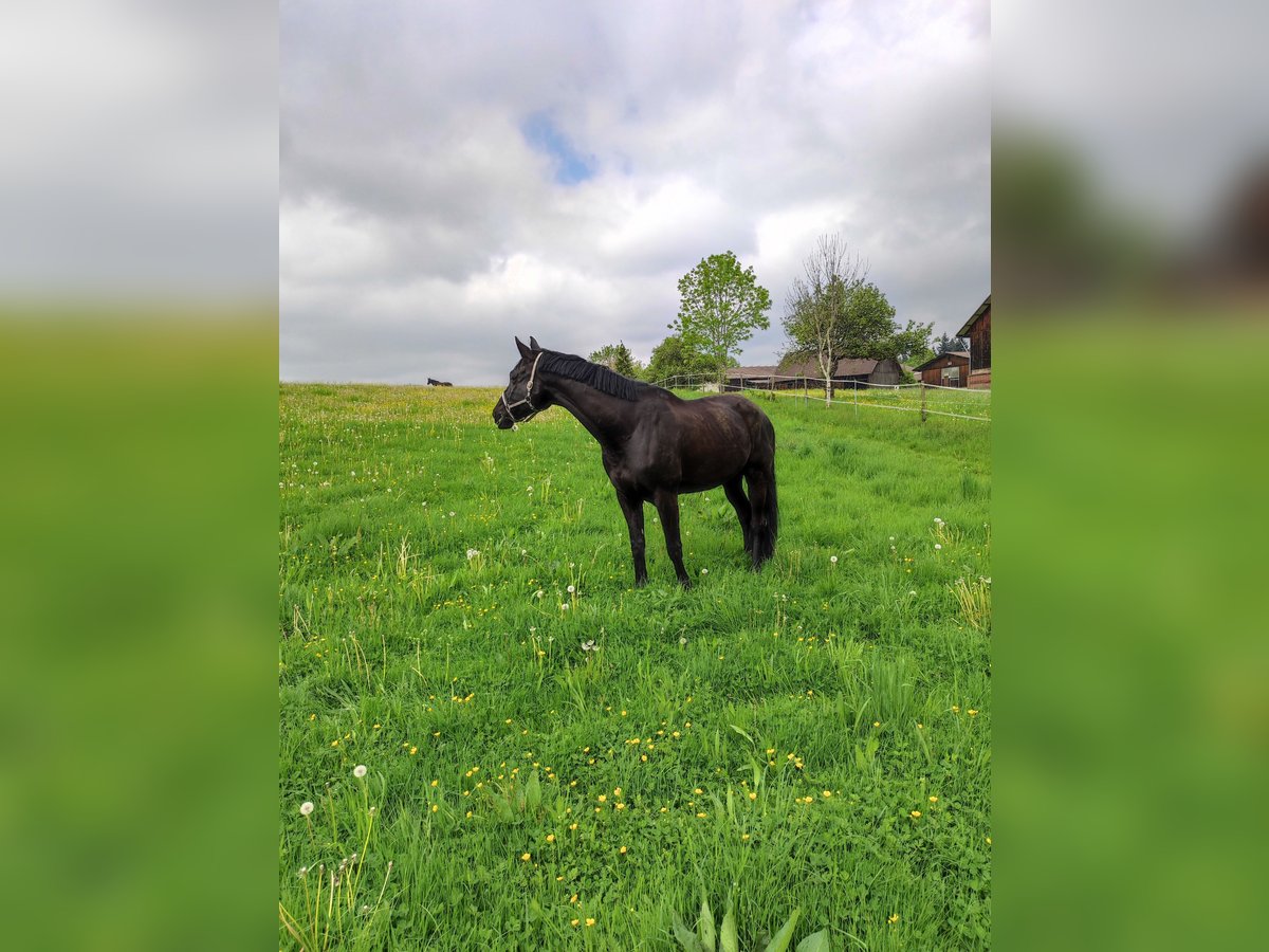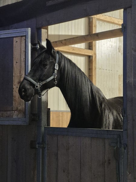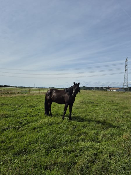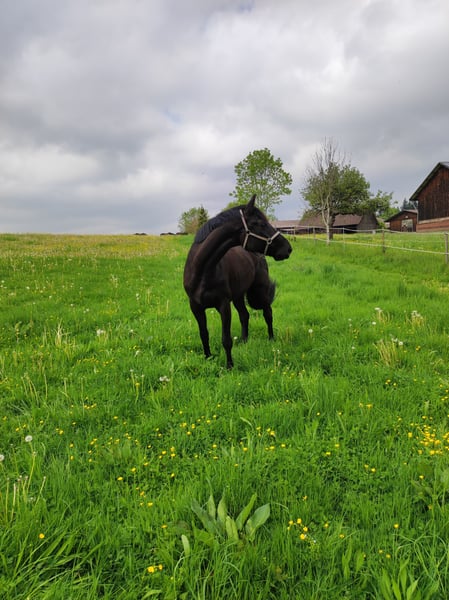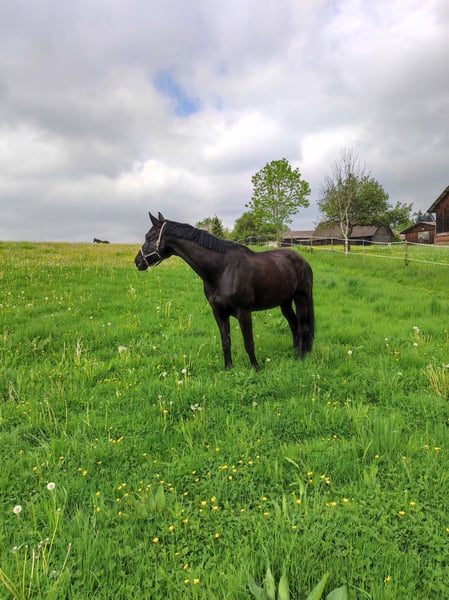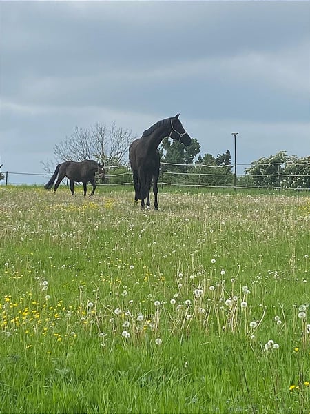 Please place my 2014-born Trakehner gelding in good hands as a companion horse. He is a beautiful black stallion with a lovely mane and tail. His height is approximately 17.4 hh. In daily handling, such as grooming, he is very well-behaved and enjoys every bit of attention. He has good hooves, is barefoot, and is very cooperative with the farrier. Due to several health issues, including kissing spines, he is being offered as a non-riding companion horse. He does not require any medication. In terms of feeding and management, I would describe him as uncomplicated. Currently, he enjoys daily turnout with my retired gelding and stays in a box at night. He has previously been part of a larger gelding herd, integrated easily, and was very social and tolerant. He is very interested, attentive, and active in daily activities. Due to his size, I would not consider him suitable for beginners. Unfortunately, he is not trailer-trained (though I must admit I never practiced loading with him). Since I am looking to buy a riding horse again, I am now seeking a good home where he can receive attention and stimulation. For further questions, please contact me at 0172 7864141.