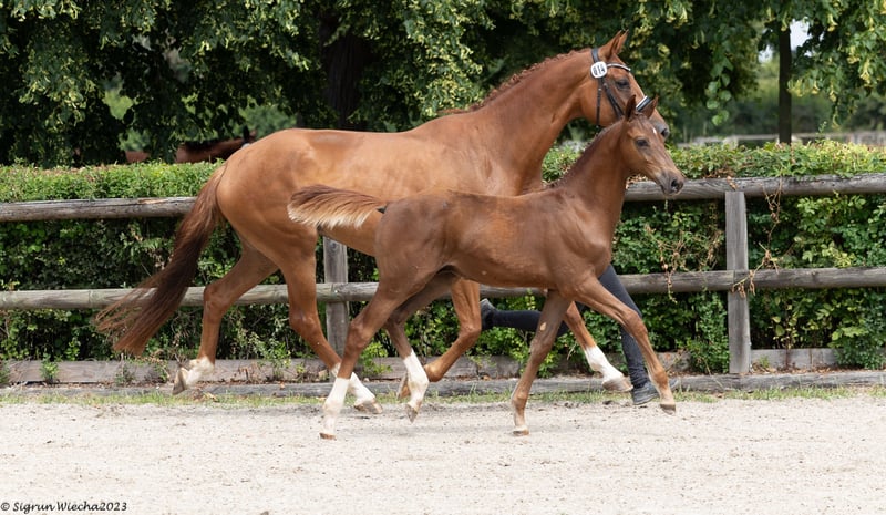 All information about him and his family can be found here: https://abraxans.com/verkaufspferde/gesellenstueck Gesellenstück is a typy, well-built colt born on February 28, 2023, from a private family breeding. This young chestnut 🦊 has excellent basic gaits and also shows great talent over fences. He descends from a very special mare line, the Glühlampe family, which has consistently produced State Premium and Elite mares. His dam, StPr and PrSt Countess Cosel, was the regional champion mare. His sister, StPr and PrSt Gold Countess, received the title of best jumping mare last year, and this year she was Reserve Champion at the regional mare show. His sire, elite stallion Imperio, was part of the Olympic squad with riding master Hubertus Schmidt. Gesellenstück has been in preparation for the licensing for about three months now. Since he is still fully developing, we decided that he should also get to know the rider in walk, trot, and canter afterward. He is currently back in the foal group to continue maturing peacefully. A castration is planned soon; however, if there is interest in promoting this valuable bloodline until the saddle licensing, please contact us as soon as possible. He has an impeccable X-ray health certificate, a very solid foundation, and has grown up healthy within a herd. Naturally, he is regularly vaccinated and dewormed. All information about him and his family can be found here: https://abraxans.com/verkaufspferde/gesellenstueck