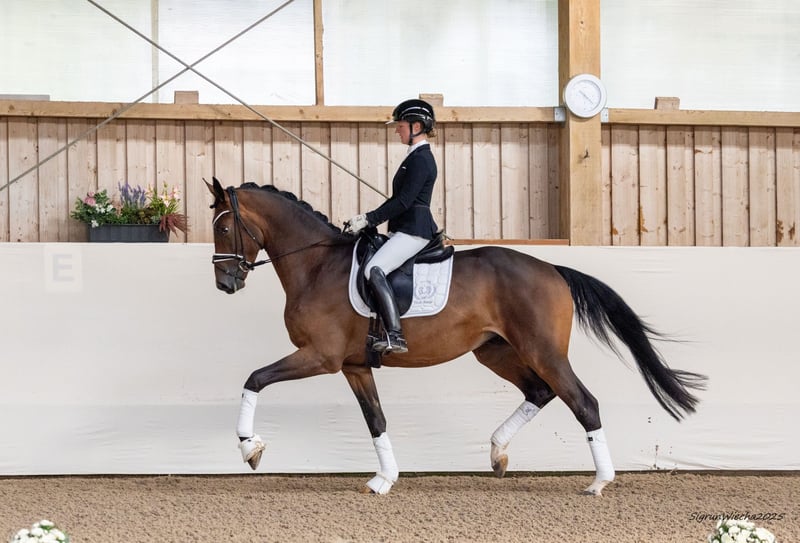 Ein wahrer Gentleman mit besonders vornehmen Manieren, gesittet im Umgang und bei aller Jugendlichkeit abgeklärt und gefestigt bei sämtlichen Anforderungen. Entdeckt auf der Bundesturnier-Fohlenauktion (BuTu ‘22/10 Heydekrug), hat er seitdem nichts von seinen sportlichen Attributen und seiner Dynamik eingebüßt. Die Mutter errang Platzierungen in Dressurpferdeprüfungen Kl. A und vertritt den Stamm der Grand Prix- und S-Dressurhelden Mon Acteur TSF, Aragorn le Grande, Arwen la Fee (alle Lutz Weyland). Weitere Informationen finden Sie unter: https://bid.trakehner.auction/auctions A true gentleman with impeccable manners, he is decent and civilized and despite his youth level-headed and confident in all situations. Discovered at the National Trakehner Show foal auction (BuTu ‘22/10 Heydekrug), he has not lost any of his athletic qualities nor his dynamic since. His dam took home placings in dressage horse classes at A and shares the same maternal family as the Grand Prix and S dressage mounts Mon Acteur TSF, Aragorn le Grande, Arwen la Fee (all of them Lutz Weyland). Further information can be found under: https://bid.trakehner.auction/auctions