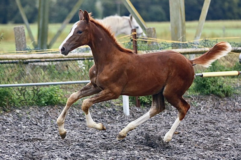 Kurz aufeinander fohlten die Lavinia-Töchter Lamara TN v. Elitehengst Goldschmidt und La Bardolina TN v. Elitehengst Dramatiker. Ihre beiden fuchsfarbenen Hengstfohlen, die von ihrer Machart, sowohl was Farbe und Typ als auch Bewegung angeht, können ihren Vater Le Chevalier TN nicht verleugnen. Der Hengst zeigt von Jahr zu Jahr in seinen Fohlen immer deutlicher seine Stempelqualität und erfüllt damit zuverlässig die an ihn gestellten Wünsche und Anforderungen. Lavinio TN versetzte uns durch seine enorme Größe und bemerkenswerte Knochenstärke ins Staunen als es endlich vor uns im Stroh lag. Bei seinem ersten Spaziergang fiel besonders sein wie in Zeitlupe gesprungener Bergauf-Galopp in die Augen. Trabmomente mit viel Knieaktionen lassen schon jetzt erahnen, was von dem kleinen ‚großen‘ Lavinio TN zu erwarten sein mag. Lavinio TN, geboren am 1. Juni 2023, v. Le Chevalier TN, in der attraktiven Dunkelfuchsfarbe verspricht auf Grund seiner kniebetonten Bewegungsmanier seines knochenstarken Fundaments und seiner Wüchsigkeit ein tolles Reitpferd zu werden. Auf der Fohlenschau wurde Lavinio als Drei-Sterne-Fohlen mit der Bestnote ausgezeichnet. Laut Beurteilung der Zuchtleitung ist auch eine Hengstanwartschaft nicht auszuschließen. Der Vater ist der einzige zuchtaktive Sohn des neuseeländischen Vollblüters Cavalleri xx. Seine Mutter, die Prämienstute La Bardolina TN stammt vom Elitehengst Dramatiker. Dieser springgewaltige Fuchshengst ist heute in China zu Hause. Auch der weitere fallende Stamm ist, unter Leistungsaspekten betrachtet, beachtlich zu nennen. Karo As v. Vollkorn xx, dann über Marduc und Mahon gehäuft arabische Gene sind Garanten für Leistung und Rittigkeit. Weitere Informationen über unser Gestüt finden Sie auf unserer Homepage www.gestüt-terranova.de.