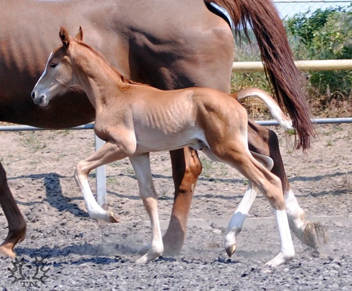 Shortly thereafter, the Lavinia daughters Lamara TN v. Elite stallion Goldschmidt and La Bardolina TN by Elite stallion playwright. Her two fox-colored colts, which are of their style, both in terms of color and type as well as movement, cannot deny their sire Le Chevalier TN. From year to year, the stallion shows his stamp quality more and more clearly in his foals and thus reliably fulfills the wishes and requirements placed on him. Lavinio TN amazed us with its enormous size and remarkable bone strength when it finally lay in front of us in the straw. During his first walk, his uphill gallop, which jumped uphill as if in slow motion, particularly caught the eye. Trot moments with a lot of knee action already give an idea of what to expect from the little 'big' Lavinio TN.