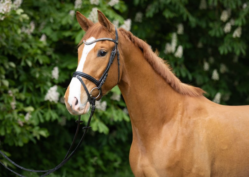 Nachtrot is a particularly intelligent and athletic son of TEMPELHOF, with a striking red coat, a beautiful markings, and an engaging personality that is impossible to resist. The chestnut features a harmonious conformation and three very good, high-quality basic gaits. The combination of the young sire TEMPELHOF with the elite stallions KASIMIR TSF and Herzruf on the dam’s side suggests excellent rideability and athleticism. In training, he proves to be eager to learn and focused. Although still fully in muscular development, he already demonstrates a high level of body awareness and balance. Nachtrot is a raw diamond with versatile talent. Not only his solid basic quality but also his wonderful character lay the foundation for a successful career as a sport horse or a very reliable leisure partner.