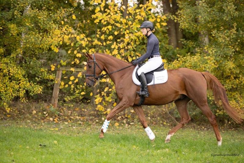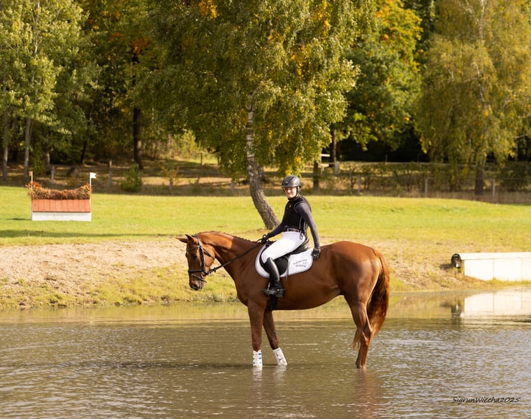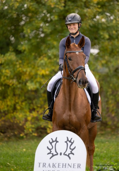 Friendly, typy riding horse directly from the breeder, currently in training for jumping and eventing. Sighted for the auction by the Trakehner Verband. Excellent bloodlines, with a successful line breeding from the dam line, which also produced the S horses Der Dürer, Der Duce, and Dar es Salaam. The sire, an Irish Thoroughbred approved by the Thoroughbred Verband, is Burma Gold, with a GAG of 94.5 and a successful racing career, ensuring excellent condition and resilience.