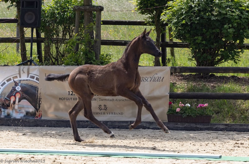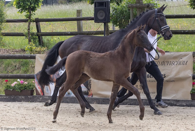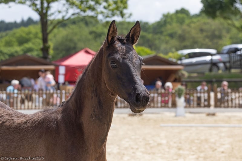 In nobility and beauty, movement quality and athleticism, she does honor to her father, the reserve champion Times Square, who also completed an excellent performance test - as well as to her brother, the riding horse champion Monsieur Perpignan, who is at the beginning of an impressive career in dressage. The noble and movement-strong mother represents a top lineage and is a sister to the licensed stallions Monseigneur, Montafon, and Mescalero: performance-focused also due to the close relation to the S-dressage horses Masur (Karin Lührs) and Magall (Diane Erpelding). For this reason, this filly possesses all the possibilities of her very slim maternal athlete family to bring new life to champion quality, combined with a father bred to an excellent sporting standard.