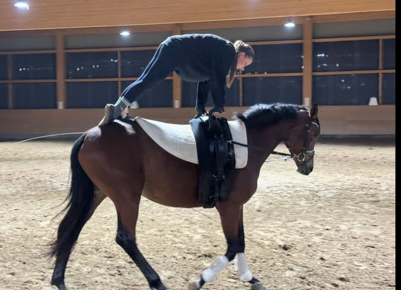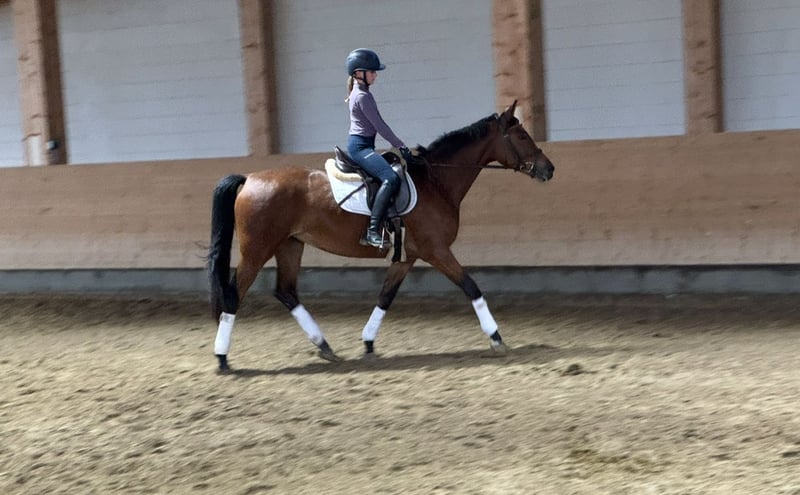 Geischa: - Charmante Trakehner Stute im kleineren Rahmen - mit drei sehr angenehm zu sitzenden Grundgangarten - Qualität am Sprung - Kopfklare Stute mit schönem Seitenbild - Leichtrittiges Familienreitpferd mit sportlicher Perspektive