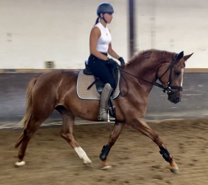 Hailey is a stunning, noble chestnut mare. In May/June 2024, she was lunged and introduced to the saddle and rider. Afterwards, she spent another year in the stable and on the pasture, as she was born late in the season. From July 2025, she was backed and started under saddle with the Bavarian Breeding Association in Munich-Riem. Impressions from the foreign rider test during her mare performance test (after 7 weeks of training!). See video! Performance test evaluations include: Character 10.0; Temperament 9.0; Willingness to perform 9.5; Conformation 9.0 Hailey is rideable (and comfortable to sit), friendly, and well-behaved. Health condition = top fit. X-ray images from August 26, 2025: no findings! Hailey’s pedigree: Sire: P.H. Karim Dorè (see attached picture – chestnut stallion) On her sire’s side, she descends from the Grand Prix dressage horses E.H. Imperio and E.H. Insterburg – the highest-rated Trakehner “Star” sires of 2025, ranked 1st and 2nd. Dam: St.Pr. and Pr.St. Hetidze v.H. (see attached picture – Rapp mare) On her dam’s side, the Trakehner stallions E.H. Monteverdi and Ibikus guarantee excellent riding horse qualities. Hailey’s very good general impression (see video at the longe line) continues to be developed – now under the rider. Hailey can be tested under saddle at any time. For inquiries and to arrange a viewing, please contact her rider and trainer, Kathrin Reisinger, at: +49 173 2732008.