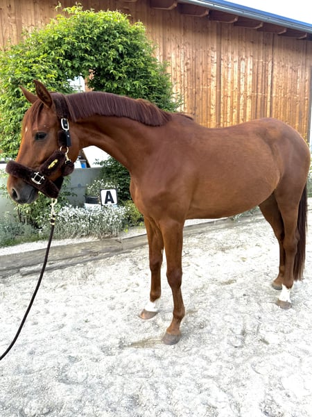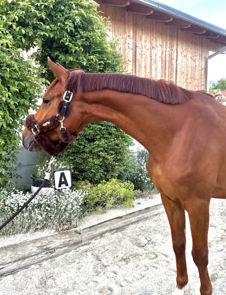 We are selling our beautiful 4-year-old Trakehner mare Belvina. Unfortunately, we currently have too many horses, and therefore we are looking for a perfect home for our self-bred mare. We bought Belvina as a foal, and she has been by our side ever since. She was started and trained by us. She impresses especially with her unique character and calmness... whether in handling, during rides, or in training, she does not show her age. Additionally, she has great basic gaits and a compact build, everything one desires from a modern dressage horse these days. Belvina participates willingly in everything and is very attentive. Generally, she is very pleasant in the mouth and establishes a nice, consistent contact. All in all, this mare has a lot of potential and trust. It is truly enjoyable to work with this horse, and she will surely have a bright future ahead of her.