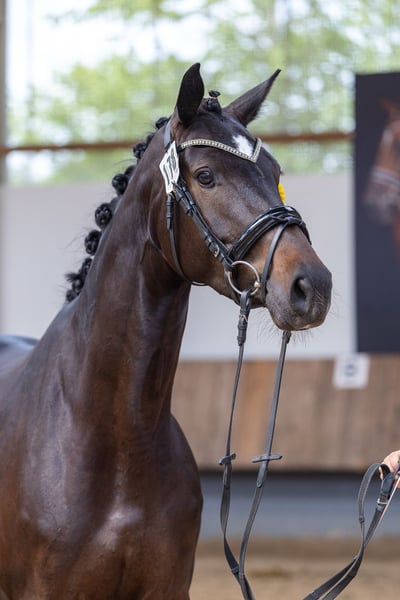 Hace pocas semanas, Hillery completó la inscripción central de yeguas y su prueba de rendimiento de manera ejemplar y con actuaciones seguras, obteniendo el resultado: ¡YEGUA PREMIADA! En la ocasión de la inscripción, destacó principalmente por su tipo y nobleza, una conformación corporal bien formada y armónica, buenas a base de pasos uniformes, especialmente un paso excelente, y además impresionó en su prueba de rendimiento con una evaluación sobresaliente de su aptitud para el salto. Por lo tanto, sigue el ejemplo de su madre Helena, quien fue evaluada con altas calificaciones y notas máximas en todos los criterios y también realizó una prueba de rendimiento de primera clase. Hillery es una de las pocas hijas del premiado semental de cría deportiva Grappa Nero. La línea materna ha sido cuidada en esta casa de cría durante generaciones y presenta, en la combinación de los sementales de buena monta Hohenstein y Latimer, exitosos en la pista de doma S, con el fundador de línea Arogno, una configuración de pedigrí de alto nivel tanto en lo deportivo como en lo criador.