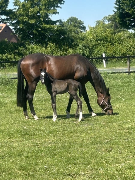 I am offering my beloved pregnant mare by Saint Cyr. She was ridden at home as a five-year-old and is very well-trained. She has never caused any problems and this year she foaled a healthy filly. She is currently pregnant again for 2026 with Morisson from NRW State Stud. Unfortunately, she injured her leg this year on the pasture; she received treatment, and her leg is slightly swollen but she is still able to move comfortably. She is compatible with other horses and is kept in a mixed herd on pasture. She is accustomed to 24/7 turnout as well as stable life. I am selling only due to reduction of my herd. Her foal can be inspected. Price is negotiable; priority is given to the right home. Please only serious inquiries.