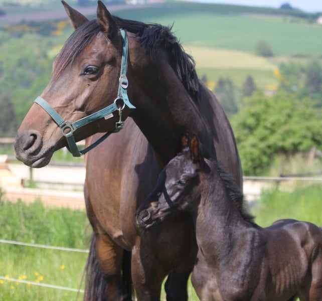 Jument Trakehner par Easy Game x Hibiskus x Catrain xx à vendre. Elle est gestante de Bonds, prévue pour la fin mai. Côté paternel, on retrouve le stallion Easy Game (de Gribaldi). Easy Game s’est fait connaître comme père du champion Millennium ainsi que de TSF Dalera BB. Le grand-père est Hibiskus, stallion Trakehner de l’année 2020. Il est réputé pour l’excellente locomotion de sa descendance. La grand-mère maternelle est la jument pur-sang Legal Cat xx, qui a eu une carrière de course réussie aux Pays-Bas. Legal Cat xx est une descendante de Storm Cat xx via Catrain xx, dont la stud fee s’élevait à 500 000 dollars en raison de sa génétique exceptionnelle. Jusqu’à présent, la jument a été utilisée comme poulinière pour la Verband Hannovre. Toutes ses poulains ont été vendus aux enchères lors de diverses ventes. Elle n’est pas encore enregistrée comme poulinière auprès du Verband Trakehner. Cependant, elle a reçu d’excellentes notes pour ses poulains : type 8,5, corps 8, fondation 8, pas 7,5, trot 8, galop 8, impression générale 8. Lors de l’entraînement au pas, elle a subi une fracture de la hanche suite à une chute. Celle-ci a bien cicatrisé. Elle se trouve maintenant sans problème dans le troupeau en pâture en stabulation libre. On peut percevoir une légère asymétrie au trot. Elle est facile à couvrir et constitue une bonne mère.