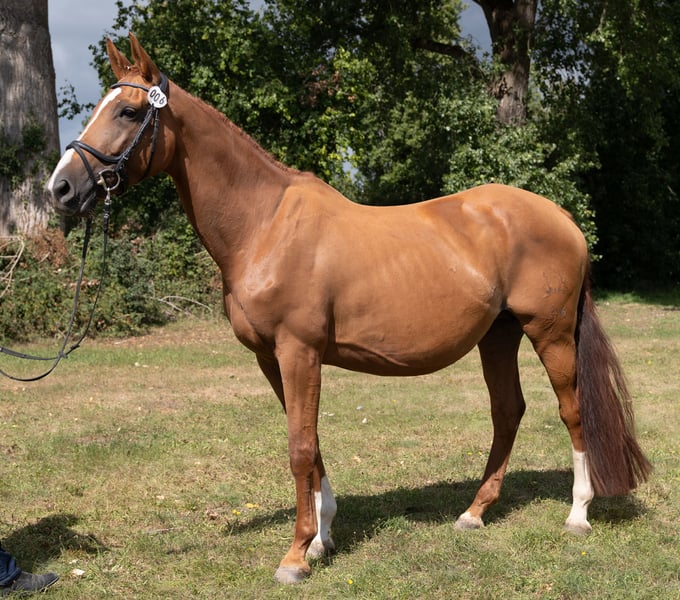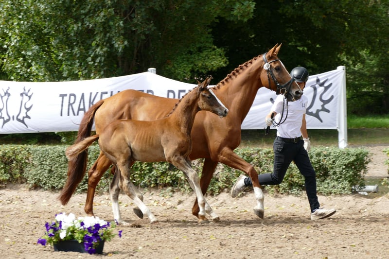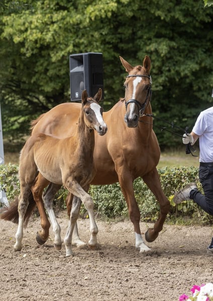 Wir bieten hiermit unsere außergewöhnliche Trakehner Zuchtstute Scarlett zum Verkauf an. Scarlett ist eine 9-jährige Fuchsstute mit einer beeindruckenden Abstammung und einem hervorragenden Zuchtpotenzial. Abstammung und Nachkommen Scarlett stammt ab vom Elitehengst E.H. All Inclusive und ist derzeit tragend von E.H. Millenium. Sie hat bereits zwei prächtige Hengstfohlen geboren und erweist sich als äußerst fürsorgliche Mutter. Ihr Hengstfohlen aus 2025 ist auf den Fotos zu sehen. Scarlett ist die Vollschwester des Reservesiegers Scaglietti, der als dokumentierter Vererber bekannt ist und bereits Vater von herausragenden Spitzenstuten wurde. Ihre Mutter Schneeflocke war eine Ikone unter den Trakehner Mutterstuten und lieferte Sportpferde bis Grand Prix Niveau. Merkmale - Leitstute: Scarlett zeigt sich stets als souveräne und ruhige Leitstute in der Herde. - Handhabung: Sie ist absolut lieb und stets leicht händelbar. - Gesundheit: Scarlett war immer gesund, mit Ausnahme einer alten, ausgeheilten Verletzung am Nackenband. - Exterieur: Mit einer Größe von 173 cm und einem stabilen Fundament ist Scarlett eine imposante Erscheinung. - Gangarten: Sie zeichnet sich durch sehr schwungvolle Grundgangarten aus. - Prämierungen: Scarlett wurde als Prämienstute des Trakehnerverbandes ausgezeichnet. Bei der Stuteneintragung erhielt sie 54,5 Punkte und absolvierte die SLP mit 7,95 Punkten. Bitte beachten Sie, dass Scarlett aufgrund der alten Verletzung am Nackenband ausschließlich als Zuchtstute verkauft wird und nicht für die reiterliche Nutzung geeignet ist. Wenn Sie auf der Suche nach einer außergewöhnlichen Zuchtstute sind, die sowohl durch ihre Abstammung als auch durch ihre eigene Qualität überzeugt, dann ist Scarlett die perfekte Wahl und könnte nach dem Absetzen des Hengstfohlens Anfang Dezember in ihr neues Zuhause umziehen. Für weitere Informationen und Besichtigungstermine kontaktieren Sie uns bitte. Wir freuen uns darauf, Ihnen Scarlett persönlich vorzustellen.
