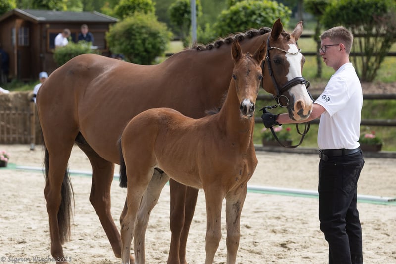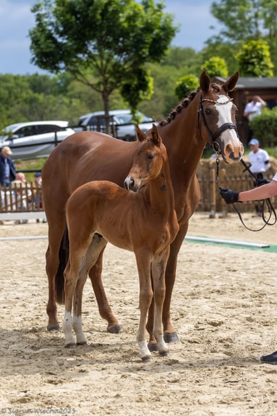 A noble young athlete of a very special kind, who also delivers an impressive business card from his father on the occasion of his sire debut on German soil! The son of the successful Charteris in the M-class, raised in the Lithuanian Nemunas stud in the best sporting manner, impresses with his athleticism, his sporty demeanor in every phase of his appearance, and in all attributes. Constructed like a future sport horse with versatile potential for all disciplines. Additionally, he moves energetically, lightly, in an unwavering rhythm. Charming in his nature: always attentive, people-oriented, friendly, and always ready to give his best – he will only bring joy in the hands of new owners. From a maternal line of exquisite athleticism, as the hard, performance-focused Anglo-Arabian Marek combines with the elite stallion and rideability guarantor Hyllos based on the famous Marke line.