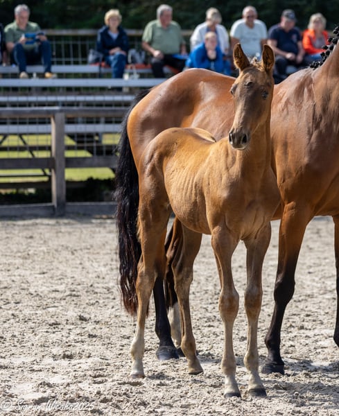 Ganz sympathischer Sohn des im Vielseitigkeitssport erfolgreichen Vererbers Painter´s Maxim, der als sicherer Vererber von typvollen, patenten und ebenso vielseitig veranlagten Nachkommen gilt. Und dies trifft sicher auch auf dieses typstarke Hengstfohlen zu, das sich noch etwas schüchtern zeigt bei seinem ersten öffentlichen Auftritt anlässlich des Trakehner Fohlenchampionats auf dem großen Paradeplatz des Hauptgestüts Graditz. Relativ spät geboren am 21.5. 2025 präsentiert sich dieser Sprössling aus der Hengstlinie des Nationenpreissiegers Waitaki im harmonischen Seitenbild des wohlproportionierten Körpers. Aufgrund der beiden blutgeprägten Leistungsvererber Imperio und Michelangelo auf der Mutterseite, die sich beide im Dressursport bis in höchste Klassen bewährt haben, ergibt sich für diese junge Nachwuchshoffnung eine gewisse Disziplin-Tendenz in Richtung Vielseitigkeit für die späteren sportlichen Erfolgsaussichten.