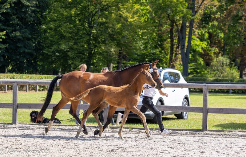 For sale is a very promising Trakehner colt foal born in 2025, with an excellent and versatile pedigree. This elegant dark chestnut impresses with his type, expression, and harmonious movement. During the inspection, he immediately convinced with ratings of 8.0 for type, 8.0 for conformation, 8.0 for foundation, 7.5 for walk, 8.0 for trot, 8.0 for canter, and an overall impression of 8.0, earning a total score of 55.5 points and qualifying for the Trakehner District North-East Foal Championship. Thanks to his sire line through Painter’s Maxim and the elite line of MV Imperio, this lively and charming colt possesses excellent prerequisites and potential in all areas of sport, as well as as a stallion prospect. Note: The foal’s location from October 2025 will be at the Main Stud Graditz.