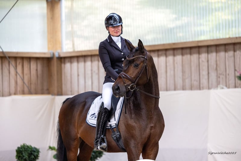 Kiano is a dressage horse with an impressive movement style, modern and expressive, and possesses an impeccable temperament. His generous, long-reaching walk, striking trot, and balanced yet energetic canter set high standards. He was licensed at Neumünster in 2024, from the first crop of his successful S-dressage sire Rheinglanz, and is closely related to the Danish champion mare Kampala (NMS 2009/85), the S-dressage horse Kronprinz, and Staffelde’s S-dressage diva Krone (Natalie Soujon). Further information can be found at: https://bid.trakehner.auction/auctions