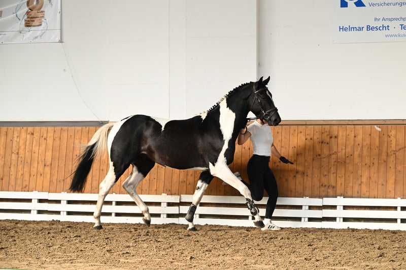 Ce puissant et compact cheval de type pie noir convainc par sa taille encore de 1,62 m et se présente comme un véritable cheval de sport avec un bel avenir. Agé de 3 ans, il provient directement du naisseur et séduit par sa clarté d’esprit, sa volonté de performer et son caractère équilibré. En daily handling, il se montre parfaitement docile, proche de l’homme et facile à vivre. Sous la selle, il travaille déjà en toute sécurité au pas, au trot et au galop, et impressionne par sa souplesse, son relâchement et son attitude de travail très agréable. Doté de bonnes allures de base, d’un joli saut et d’une forte volonté de coopérer, il possède toutes les qualités pour une carrière sportive polyvalente – que ce soit en saut d’obstacles, en dressage ou en extérieur. Un jeune étalon sincère, doté de cœur, de talent et de perspectives – prêt à démarrer avec son futur cavalier vers de nouveaux horizons. 💫 À céder directement du naisseur à des mains bienveillantes.