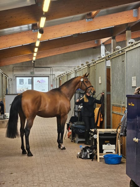 Night Temple by Tempelhof x Interconti, out of the distinguished mare St.Pr. and Pr. St. Nachtfürstin (T17C1a Nakita - Söchtig-Elmarshausen), presents himself as a powerful, completely clear-headed, well-mannered, and sportily ambitious competition partner with all the potential. His dam is the sister to the highly sought-after auction star Pr. St. Namika and represents a maternal dynasty that embodies both top-level hippological breeding and innovative breeding philosophy. The unforgettable granddam was already regarded as an breeding institution beyond the borders of her home stud Elmarshausen and produced, among other achievements, the licensed stallion Nachtruf and no less than seven daughters, some with double premiums, including the successful M-level dressage horse Nuschka (ex Nachtmusik). Night Temple is the first licensed son of his sire, Tempelhof. Night Temple himself is licensed, has already completed the performance test, and has also proven himself successfully in competition. In three show starts, he always placed among the top three horses. At three years old, he earned a silver medal in the young horse championship's dressage test and a bronze in the final. At four, he achieved first place in his debut jumping competition. Night Temple is always fully focused and attentive to his rider. In the foreign rider test, he received top marks with a score of 8.5. He is easily handled by ladies and demonstrates absolute reliability and good manners in handling. We see Night Temple both in high-level sport and in breeding. An ultrasound examination with crystal-clear X-ray images is available. Night Temple has been examined multiple times for licensing and performance testing and is absolutely healthy.