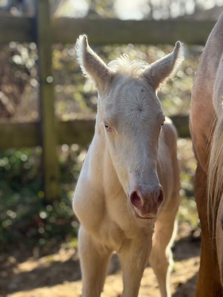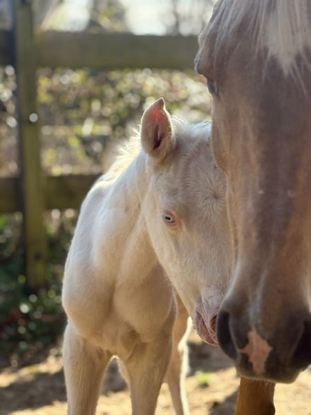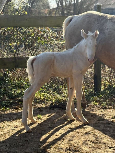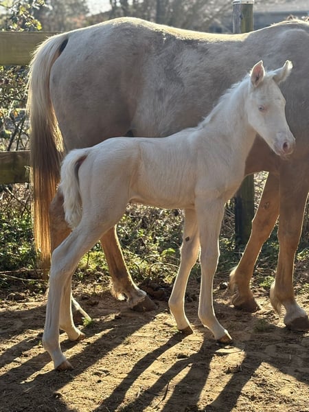 Hier bietet sich eine äußerst seltene Gelegenheit ein Farbjuwel für die Warmblutzucht zu erwerben. Dieser Cremello Sprössling bekommt volles Trakehnerpapier und bietet sich für die Veredlung an, da Mutter eine Araberstute ist und der Vater ein Englischer Vollblüter ist. Seine Mutter hat die Stutenleistungsprüfung über Distanzritte bis 80km abgelegt, sein Vater wird im Springsport vorgestellt. Auf den Bildern ist er 3 Tage alt, neue Bilder folgen regelmäßig.