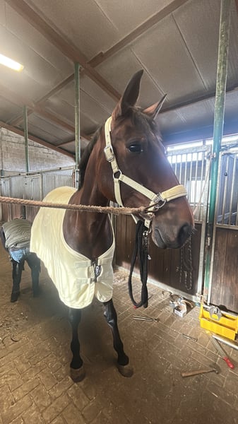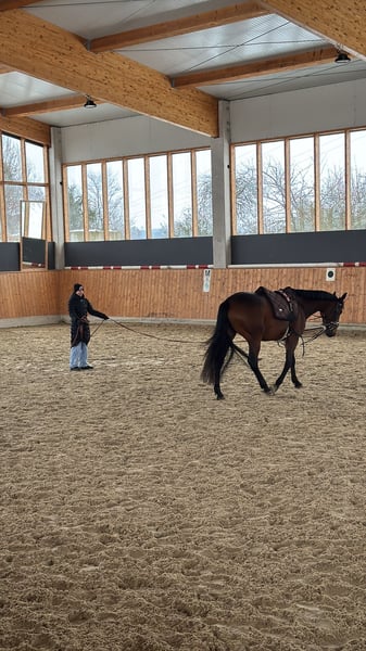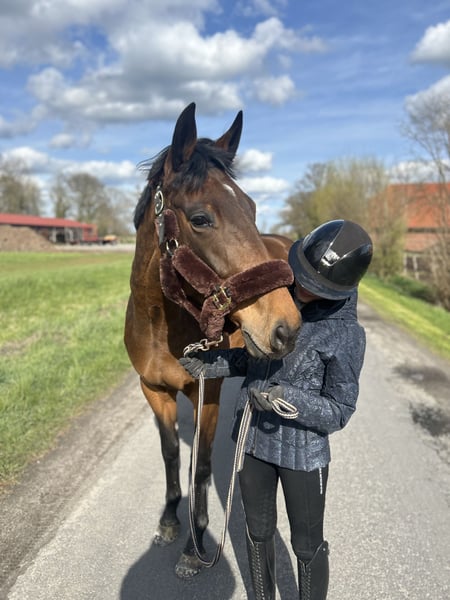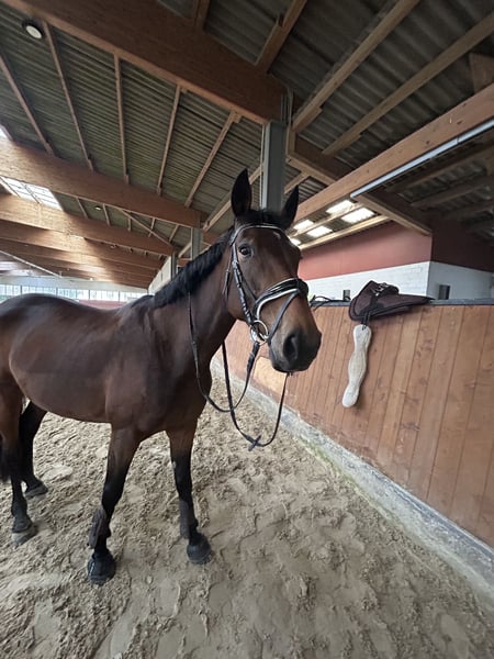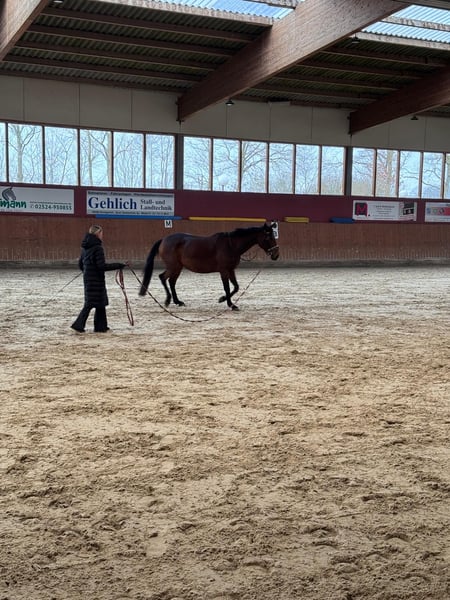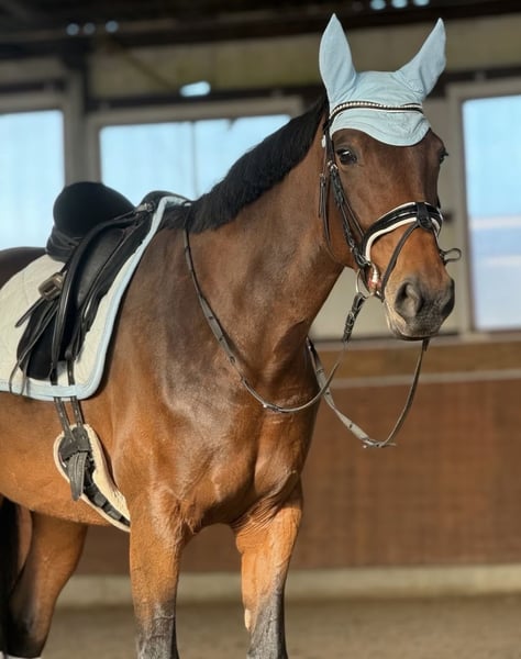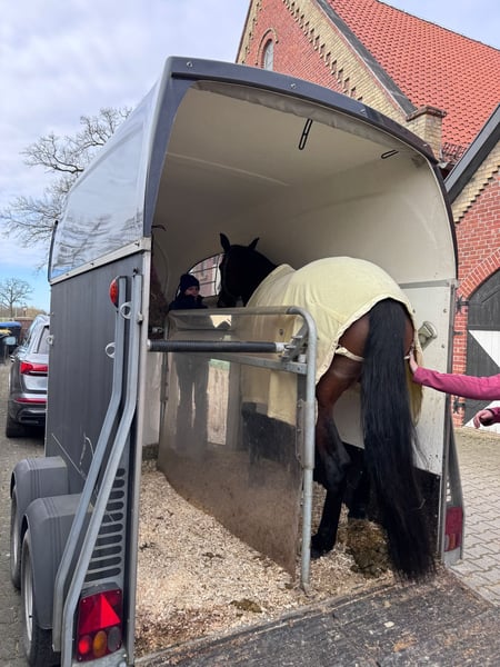 Zum Verkauf steht die 5-jährige Traberstute Louane Memory TF (geb. 2021) mit einem aktuellen Stockmaß von ca. 1,65 m (noch im Wachstum). Louane befindet sich aktuell im Beritt und zeigt sich als sensible, aber ehrliche Stute mit Entwicklungspotenzial. Sie verfügt über gute Grundgangarten, hat jedoch aktuell noch Schwierigkeiten beim sicheren Angaloppieren und benötigt hierbei eine klare, führende Hand. Im Gelände ist sie absolut zuverlässig und unerschrocken – auch größere Fahrzeuge wie LKW oder Traktoren sowie andere Tiere sind für sie kein Problem. Unter dem Sattel zeigt Sie ihre sensible Art, weshalb sie von einem erfahrenen Reiter gut gefördert und weiterentwickelt werden kann. Hier bedarf es einen klaren Rahmen,Erfahrung und Ruhe. Ausbildung & Eigenschaften: • im Beritt • geländesicher • vom Boden aus gearbeitet • nicht schreckhaft • kennt Umweltreize (LKW, Traktoren, Tiere) • verträglich mit anderen Pferden • schmiedefromm Weitere Angaben: • gute Abstammung, daher auch interessant für die Zucht • gesund • mit Papieren • Zubehör inklusive (z.B Kentaur Dressur Sattel) Standort: 59269 Beckum Das probereiten kostet 30€, die beim Kauf selbstverständlich angerechnet werden. Louane wird nur in erfahrene und fördernde Hände abgegeben. Platz vor Preis.