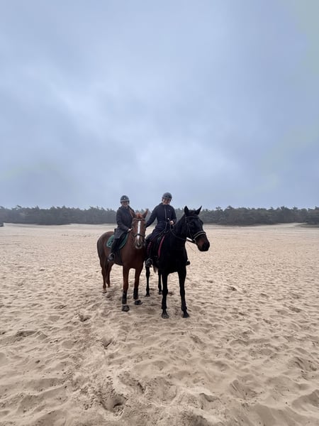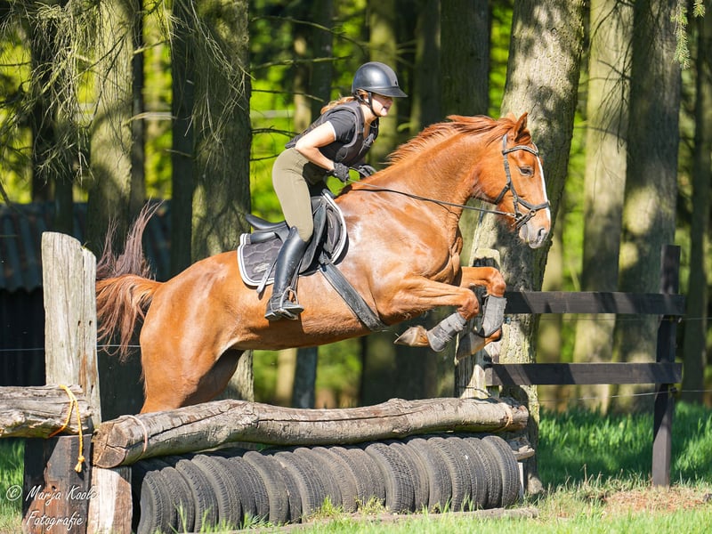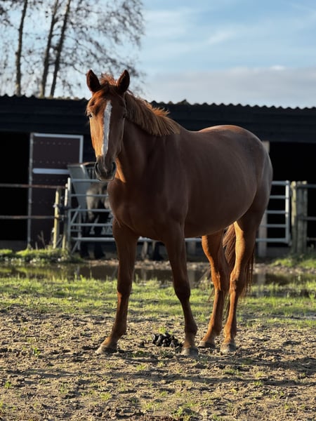 Liv is a stunning, honest mare born in 2021 (French Standardbred, 16.1 hh) with a wonderful temperament and a highly willing work ethic. She is calm on unfamiliar terrain, steady in the woods, and approaches new tasks with great enthusiasm. Liv has participated in dressage, jumping, and cross-country lessons, consistently demonstrating her quick learning ability across all disciplines. She responds well to leg aids, is familiar with lateral movements, and shows a nice jump. She enjoys jumping and cross-country riding with visible pleasure. In handling, Liv is a true cuddle: affectionate in the stable, easy to manage with the farrier, dentist, and when loading onto the trailer. She is eager to work and has a friendly nature, but is not suitable for a complete beginner. She naturally tends to move a bit faster and is still working on her balance, making her best suited for a rider with some experience. Price: €8,500 No rush to sell; Liv will only go to the right match. Videos and more information available upon request.