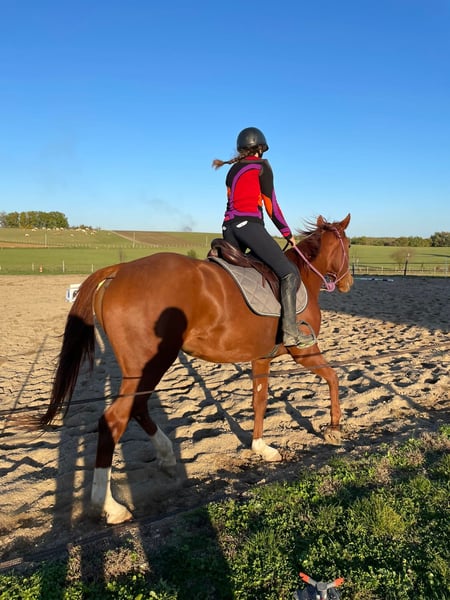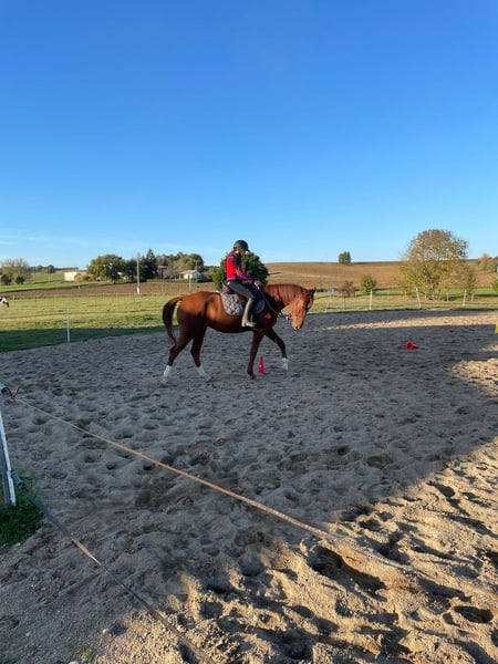 Heva JOY -très jolie jument cherche sa famille de cœur Soumensac 47120 née le 03/05/2017 Présentation : Voici Heva jument PP Alzan de 8 ans et choyée à la maison c'est un vrai soleil au quotidien gentille respectueuse des clôtures Elle adore qu'on s'occupe d'elle, et donne volontiers son cœur à qui prend le temps de la connaitre Origine: Mère : Rose JOY Père: Rex HAIE NEUVE Coté travail: Heva à remettre au travail après poulinage elle enchaine un parcours 70cm, 80cm à la maison peu sauté 1m voir plus travail aussi bien en filet sans mort qu' en licol éthologie, adore le travail à pied et liberté Eduquée : niveau savoir4 en équitation éthologique, elle est volontaire . galop4 équitation Caractéristique: Age 8 ans Taille 1,63m Belle locomotion, un galop classe et fluide Potentiel loisir et sportif Coté santé: Heva n'a pas de problème de santé et très bonne mère suivie par dentiste, osthéo , maréchal et véto vermifuge vaccin à jour bref: une jument chouchoutée et bien dans c'est sabots Idéale pour: Un(e) cavalier(e) galop 4 à expérimenté souhaitant partager des moment de plaisir et de complicité Elle partira uniquement dans une bonne famille ou son bien être sera une priorité