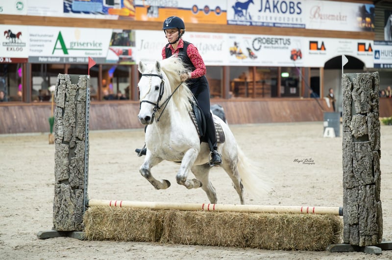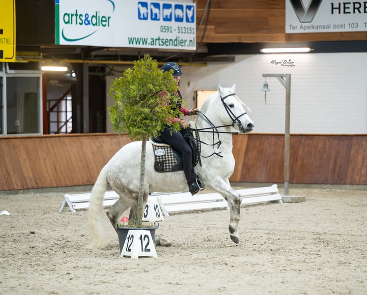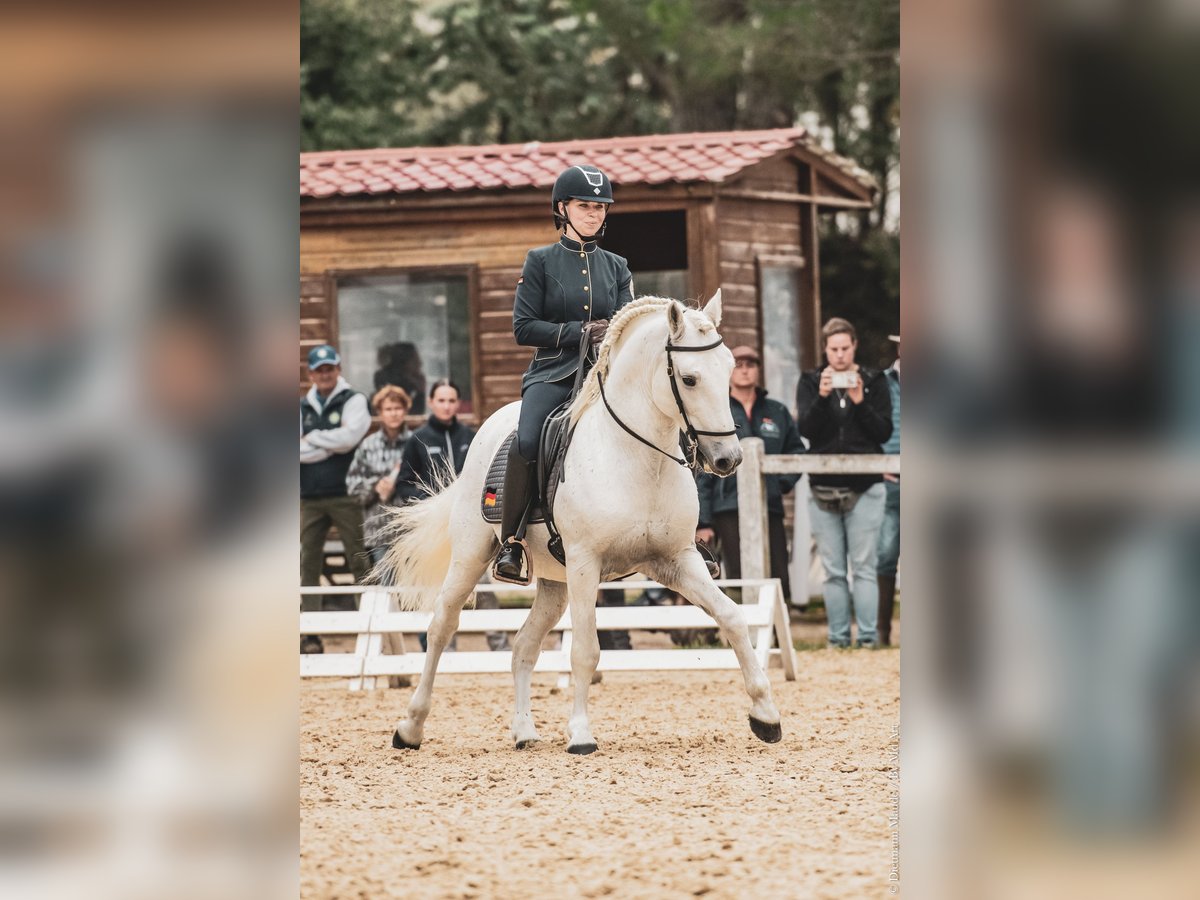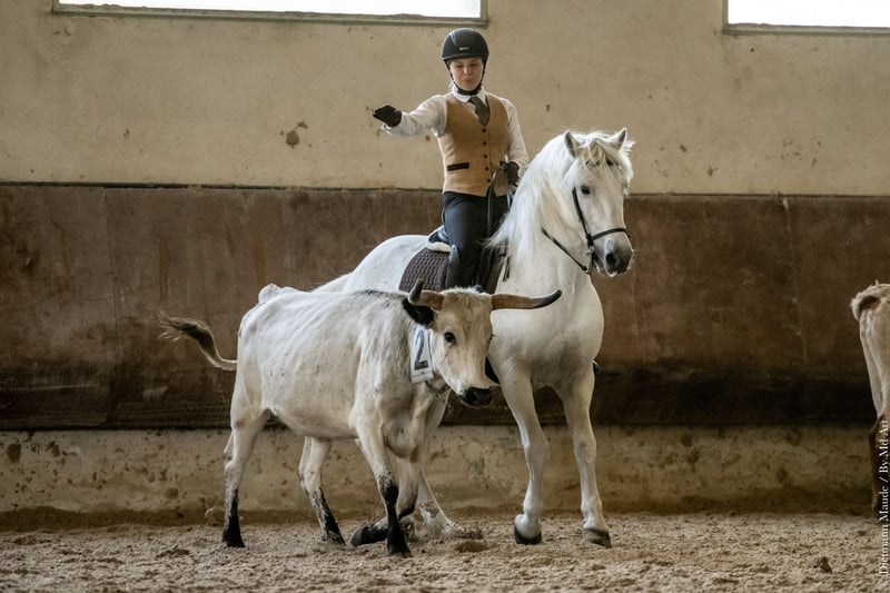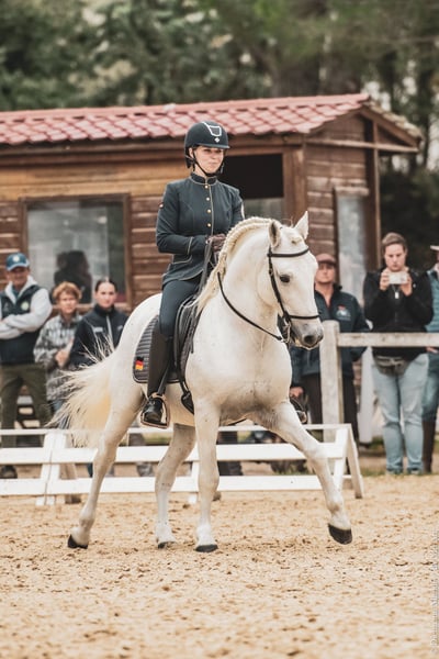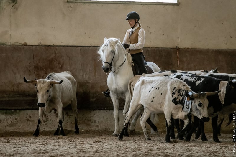 Barockes Mähnenwunder Voyou ist ein sehr dominanter Bursche, der sich dennoch seinem Weidepartner Wallach genügsam unterordnet. Der klügere hat seine Ruhe. Er ist ein sehr fleißiger engagierter und häufig laut kommunizierender Kerl. Sein Nachwuchs ist mit einer Mördermähne ausgestattet, die er von seiner Mutter über Tanpis du Mas geerbt hat. Die Ausbildung des Pferdes macht unglaublich Freude, weil er sehr konkret reagiert und feinfühlig ist. Voyou ist fürs Turnier bis zur Masterclass ausgebildet, packt Geländehindernisse wie Trailhindernisse völlig unbeeindruckt an. Er arbeitet in der Dressur sowohl bei den fliegenden Wechseln als auch in der Piaffe energisch mit. Beim Ausritt läßt er gern mal camarguetypisch so richtig Tempo heraus, ist aber jederzeit herunter zu regulieren. Seine herausragenden Qualitäten hat er bei der FITE EM 2024 zeigen können, bei der er eine Bronze-Medaille errang. Auch an den Rindern wird dieses Pferd gearbeitet. Wir erhalten damit die Ursprünglichkeit der Rasse und testen nicht nur ihren Will-to-please als Arbeitspferd, sondern auch ihre Rindertauglichkeit.
