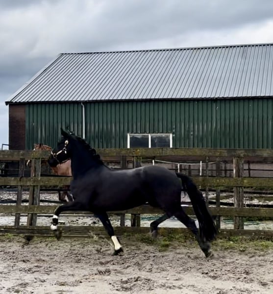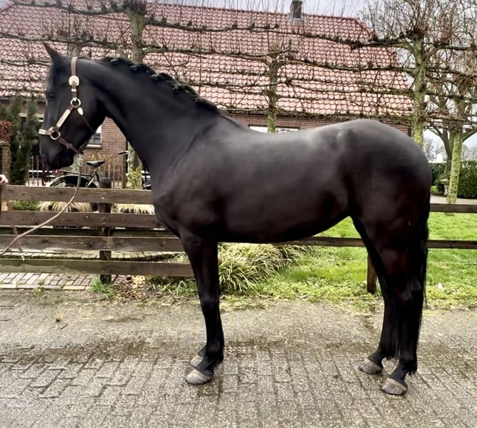 A 4.5-year-old PRE x Friesian black mare She is 1.60 m tall, with a lot of substance and will definitely grow a bit more. Libby is very active and has three very good gaits. Aside from some lunging, she is still green and completely untrained. She holds a passport.