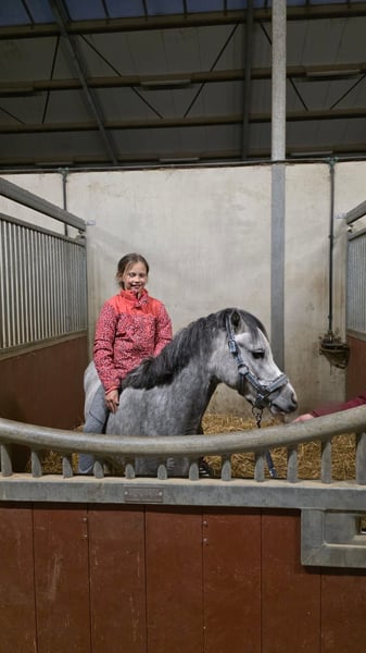 Happy Moon is een hele knappe welsh A merrie van 1.23m uit april 2022, ze is dus bijna 4 jaar. Happy is mega lief en braaf aan de hand. We zijn rustig aan bezig met haar opleiding. Aan de longeerlijn kent ze netjes alle stemhulpen, ook is ze inmiddels zadelmak. We zijn bezig met haar beleren onder het zadel. Ze loopt netjes alle 3 de gangen. Is soms wel vlug en daarom (nog) niet geschikt voor een klein ruitertje. Voor een ruiter die al wat kan of voor iemand die haar wil beleren voor de wagen is zij een onwijs gave merrie. Met een ruiter die netjes verbinding houdt, loopt ze ook makkelijk in aanleuning. Ze heeft 3 mooie gangen, en haar draf is echt fantastisch. Ze loopt met veel gemak! Happy is gewend om in een groep te lopen. Staat bij ons in een loopstal met andere pony's en gaat in een grote groep in de wei of paddock. Ook zou zij een super leuke merrie kunnen zijn om mee te fokken! Heeft vol welsh papier. Haar vraagprijs is 3500,- bij snelle afhandeling is deze enigzins bespreekbaar.