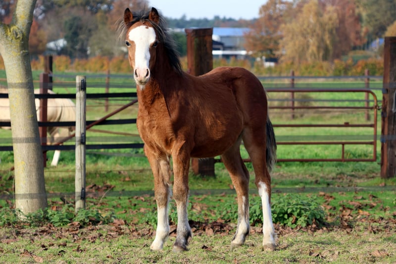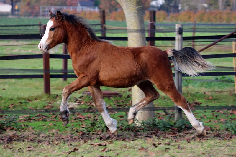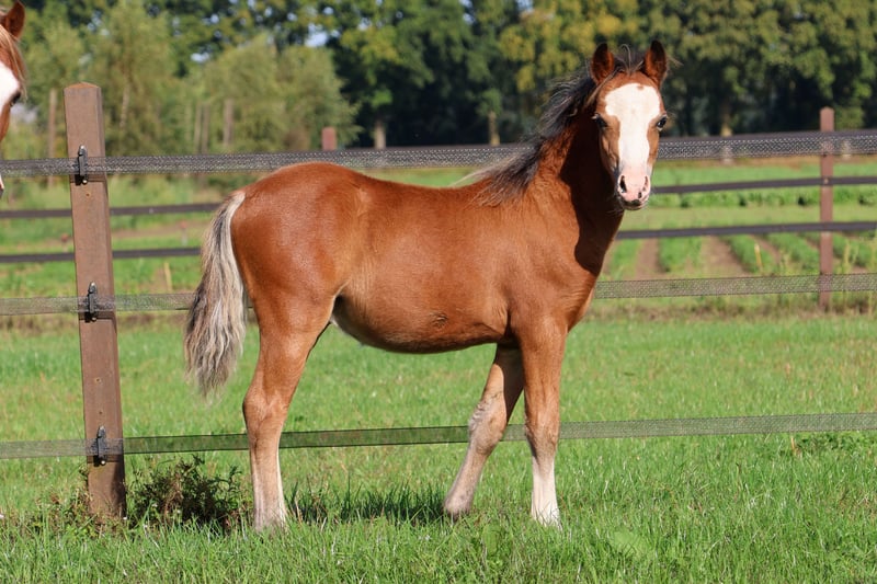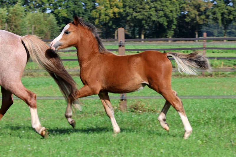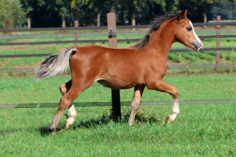 Looking for a new owner! Our Welsh Mountain stallion foal, Dijks Freki, is ready to move on, so we are searching for a new home for this cheerful and energetic young colt. He was born in May, is bay in color, and has lots of energy. He is expected to reach approximately 1.18 meters. His sire is the charming stallion Airborne Montgomery. His dam is my chestnut roan mare, Powys Fflur-Coch (by Islyn Buzz). She has already foaled two foals, one of whom is now working as a children's pony. This colt also shows promising potential to become a well-behaved children's pony in the future or to be a lovely driving pony. Freki has an WPCV passport, is microchipped, and is well-behaved on the lead. He has been gelded and is ready to move immediately. Please send a private message if interested.