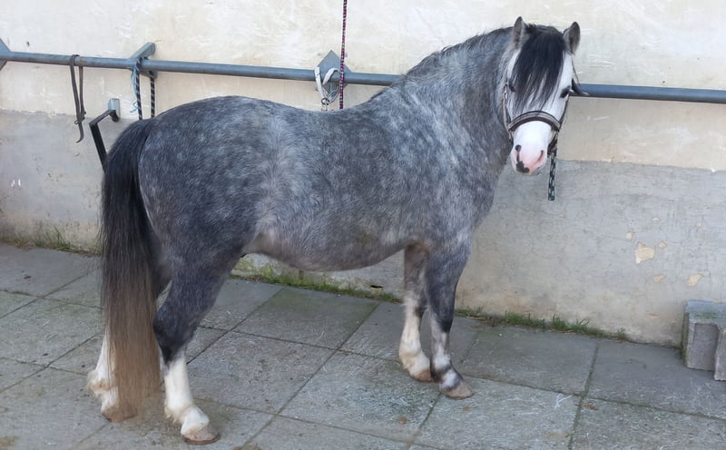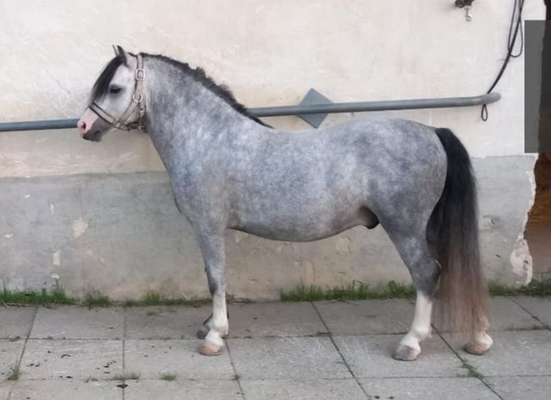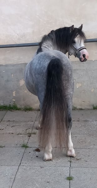 Stylish A-Welsh stallion. Pulled and driven in a pair of two, with a very lively walk, eager to work, always eager to please. Currently being acclimated to rider’s weight, which he handles very confidently. Playful and curious, accustomed to both paddock and stable. He has not been used for breeding yet, which makes him very manageable around other horses. Not stallion-like at all! If you're looking for a charming little horse, Henry would be the perfect choice.