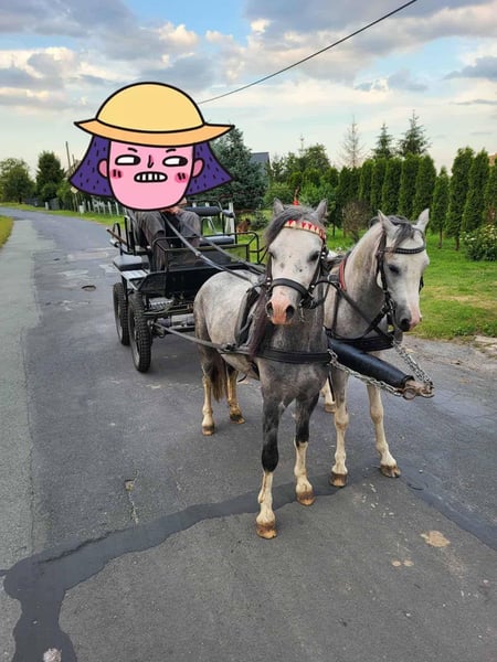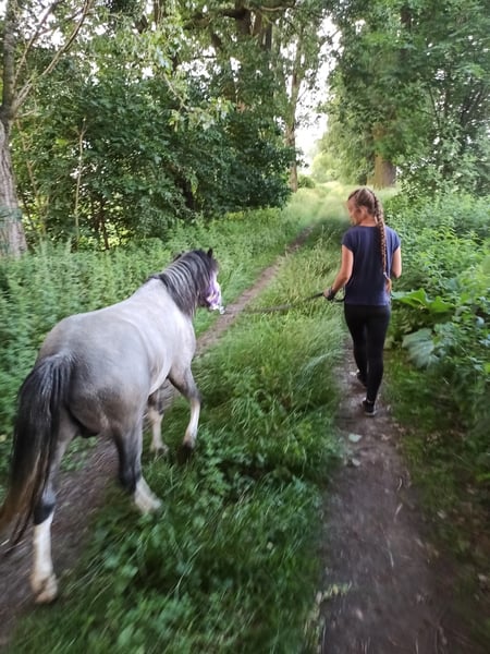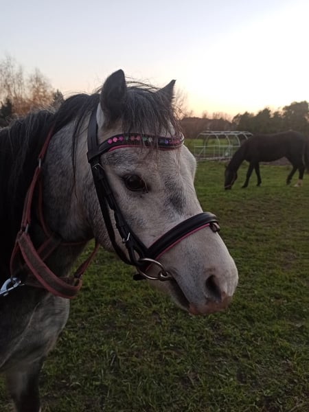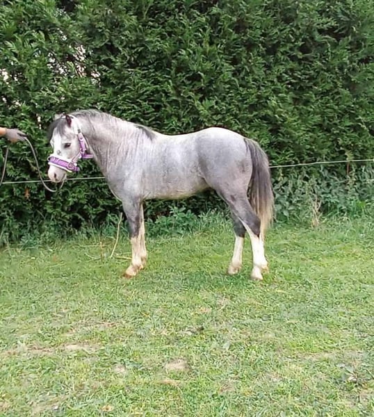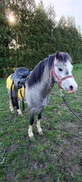 Zum Verkauf steht ein 4-jähriger walisischer Hengst mit Lizenz. Er ist ca. 115–120 cm groß. Der Pferd ist in den drei Grundgangarten ausgebildet, hat mit dem Arbeiten an der Longe unter Reiter begonnen. Er geht selbstständig ins Gelände, entweder alleine oder mit einem Wallach. Im Gelände ist er wetterfest, man kann ihn auch lose an der Longe reiten. Er ist nicht nervös im Trab, aber auch kein Fluchttier, sondern kooperativ und willig. Er hört auf Stimme. Er wurde von einer erwachsenen Person eingeritten, daher ist er kein durch unerfahrene Kinder zerstörter Pony. Auch von einer Juniorreiterin geritten, die problemlos mit ihm zurechtkam. Das Pferd toleriert Stuten hinter der Hecke während der Arbeit und kann auch im Gelände mit einer Stute unterwegs sein, solange es nicht direkt hinter ihr reitet. Im Roundpen sollte noch an diesem Verhalten gearbeitet werden, was aufgrund der Bedingungen bisher nicht möglich war, aber es sollte kein Problem darstellen, da das Pferd sehr feinfühlig und kooperativ ist. Es ist auch im Wagen in Paar- oder Einspännerfahrt einsetzbar. Zudem hat es an Erntefesten teilgenommen, bei denen die Menge und Traktoren hinter ihm keine Wirkung zeigten. Vom Boden aus korrekt ausgerichtet, geht auf der Longe auf Stimme, überwinden die Stangen, wechselt die Richtung auf Distanz, macht Taktwechsel auf der Longe, Wendungen auf der Hand, Rückwärtsrichten. Freilaufend springt es bis zu 90 cm, was ihm keine größeren Schwierigkeiten bereitet hat; höheres wurde bisher nicht getestet, altersbedingt. Im Umgang ist es ruhig, bei Stuten bei der Arbeit manchmal unruhig, aber nicht aggressiv. Es ist häufig unterwegs gewesen und in neuen Umgebungen zuverlässig. Es geht problemlos in den Anhänger, hat mehrere Ausfahrten hinter sich, auch nach Training mit Patryk Maciąg. Es besitzt eine Zuchtbuchnummer, somit ist es neben einem hervorragenden Reitpferd auch ein vielversprechendes Zuchtmaterial. Die Mutter ist die niederländische Stute Lotte, die durch ihr ausgezeichnetes Wesen besticht und dieses an ihre Nachkommen weitergibt. Der Vater ist Romeo, der eine schöne, korrekte Konstitution besitzt und diese eindeutig an seinen Sohn weitergegeben hat. Link zur Abstammung: https://baza.pzhk.pl/kon/?horse_id=1417151