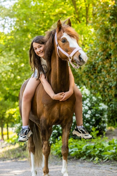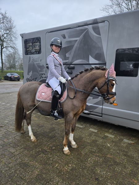 Onze lieve Wynswood Elfie WNE mag een nieuw ruitertje alle kneepjes van het vak leren! Elfie is een 9 jarige ruin. Hij is 130cm groot (zonder hoefijzers) en allround opgeleid door mijn dochter. Wij hebben hem vanaf zijn 3de en inmiddels alles met hem gedaan. Dressuur: Hij is M1 geklasseerd met winst. Hij loopt makkelijk nageeflijk, heeft fijne gangen en een hele fijne verzamelde galop. Verruimen doet hij heel mooi en krijgt hij vaak hoge punten voor! Ook de zijgangen gaan hem gemakkelijk af. Springen: Elfie is uitgebracht t/m 60cm springen, maar heeft nog meer potentie. Hij krijgt vaak hoge stijlpunten en in de barrage kan hij lekker snel zijn. Cross: We zijn sinds kort begonnen met crosstrainingen. Dit pakt hij super goed op. Elfie is naast een sportpony ook een echte kinderpony waar je veel lol mee kunt hebben. Zonder zadel, zonder hoofdstel, bosritjes, strandritjes, alles vindt deze pony leuk! En alles doet hij super braaf. Hij is nooit fris of heet en nooit Onze lieve Wynswood Elfie WNE mag een nieuw ruitertje alle kneepjes van het vak leren! Elfie is een 9 jarige ruin. Hij is 130cm groot (zonder hoefijzers) en allround opgeleid door mijn dochter. Wij hebben hem vanaf zijn 3de en inmiddels alles met hem gedaan. Dressuur: Hij is M1 geklasseerd met winst. Hij loopt makkelijk nageeflijk, heeft fijne gangen en een hele fijne verzamelde galop. Verruimen doet hij heel mooi en krijgt hij vaak hoge punten voor! Ook de zijgangen gaan hem gemakkelijk af. Springen: Elfie is uitgebracht t/m 60cm springen, maar heeft nog meer potentie. Hij krijgt vaak hoge stijlpunten en in de barrage kan hij lekker snel zijn. Cross: We zijn sinds kort begonnen met crosstrainingen. Dit pakt hij super goed op. Elfie is naast een sportpony ook een echte kinderpony waar je veel lol mee kunt hebben. Zonder zadel, zonder hoofdstel, bosritjes, strandritjes, alles vindt deze pony leuk! En alles doet hij super braaf. Hij is nooit fris of heet en nooit gemeen. Bokken, steigeren en wegrennen doet hij nooit. Ook met onervaren kindjes is hij super lief en past zich volledig aan. Als kleine kindjes hobbelen, hem per ongeluk in zijn mond trekken of niet duidelijk zijn met been of zweep dan maakt hem dat niets uit. Hij is eerder traag dan snel! Hij staat momenteel in onze paddock paradise met 2 andere ruinen en een merrie. Elfie is lief in de kudde en niet dominant. Elfie is geschikt voor een beginnende ruiter of voor een gevorderde. Hij past zich snel aan!