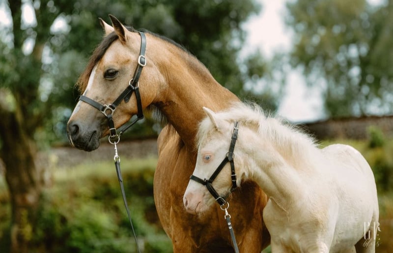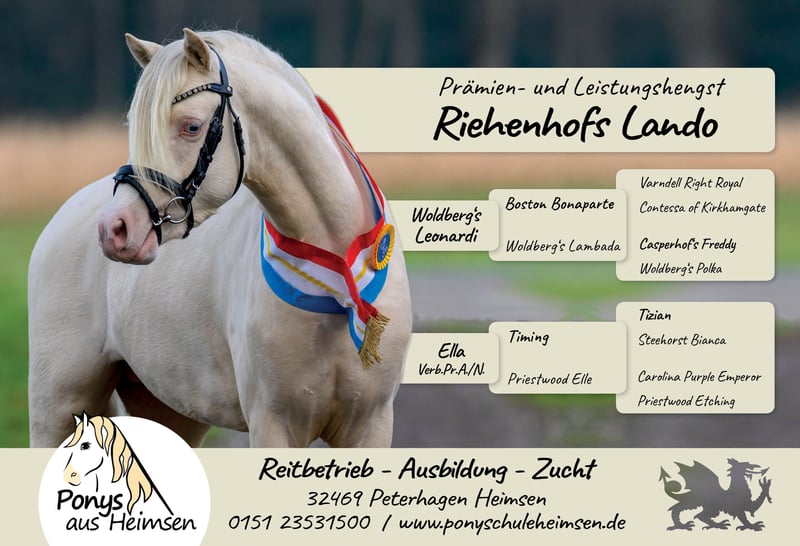 Lindos Blue ist ein wunderbar im Welsh Pony Typ stehendes Hengstfohlen mit bester Bewegung und Ausstrahlung in Sonderfarbe. Hier kommt die bewährten Gregory Linie mit bestem Leistungsblut von Riehenhofs Lando (v. Woldbergs Leonardi) zusammen. Alle Halb- und Vollgeschwister gehen zuverlässig mit Kindern, unter kleinen Erwachsenen in den höheren Klassen Dressur und erfolgreich vorm Wagen. Die Mutterstute ist eine unserer nervenstärksten und verlässlichsten Ponys und geht auch in der Reittherapie. Sie ging bereits erfolgreich im Ein- und Zweispänner (zusammen mit der Mutterstute) Dressur und Marathon bis Klasse L. Lindos ist ein sehr präsentes, mutiges und freundliches Fohlen mit dem Herz am rechten Fleck. Er weiß sich zu präsentieren und ist immer für neue Dinge zu haben. Auf den Fohlenbildern sieht man seine schönen Abzeichen und die besondere Blesse. Weil er so dunkel war, gehen wir davon aus, dass er ein Perlino ist (doppelt aufgehellter Brauner), mindestens jedoch ein Cremello. Ein genauer Farbtest ist natürlich möglich. Mit dem Fellwechsel wurde er nun hell. Lindos steht auf einem sehr kräftigen und korrektem Fundament, mit starkem Rücken und Hals. Er ist Prämienfohlen und hat sich zum Fohlenchampionat qualifiziert, wo er Höchstnoten erhielt. Sein Vater Riehenhofs Lando überzeugte kürzlich bei seiner HLP mit einer 8,85 in Offenbüttel, ist Prämien- und Leistungshengst und steht bei uns auf Station. Er stammt ab vom hoch erfolgreichen Woldberg‘s Leonardi, der 2023 bei der FN-Bundeshengstschau auf der Grünen Woche in Berlin zum Bundes-Reservesieger im Schauwettbewerb der Welsh Ponys (Sektion B) gekürt wurde und die FN-Bundesprämie erhielt. Die letzten Bilder zeigen die Mutterstute in unserer Ponyschule und vorm Wagen, sowie unseren Prämienhengst Riehenhofs Lando, der Fremdstuten in 2026 im Natursprung zur Verfügung steht. Lindos wächst gemeinsam mit seinem Halbbruder in unserer Wallachherde auf, tobt und spielt im Offenstall und auf der Weide. Er ist durch die erwachsenen Pferde bestens sozialisiert und genießt das Leben gemeinsame Spielen sehr. Sein starkes Fundament und hoher Halsansatz zeigen seinen schönen Hengsttyp - dem Vater aus dem Gesicht geschnitten. Regelmäßig entwurmt und mit bestem Fohlenfutter versorgt. Er kennt das Fohlen-ABC, geht brav am Halfter, kennt Hufe geben und anbinden. In unserem Betriebsalltag lernt er alles, was ein zukünftiges Kinder- und Fahrpony kennen sollte. Ein Pony mit besonderem Look, dem alle Türen offen stehen und das die Welt gemeinsam mit der Familie entdecken möchte! Er ist abgesetzt und könnte ab sofort in ein neues Heim ausziehen. Wir wünschen uns für ihn (Welsh-) Pony erfahrene Menschen oder Züchter, die sich mit der Aufzucht und Ausbildung von Jungpferden auskennen oder bei dieser Aufgabe von erfahrenen Personen unterstützt werden. Alles weitere besprechen wir gern telefonisch oder vor Ort und freuen uns auf Eure Anfrage - man kann über alles sprechen! Nicht nur merken - auch anrufen - wir beißen nicht :) Keine Ratenzahlung. Wir bieten keinen Aufzuchtsplatz vor Ort. We speak english! Ponys aus Heimsen - www.ponyschuleheimsen.de