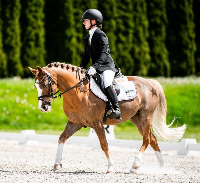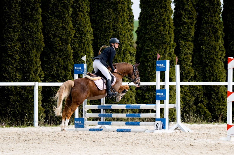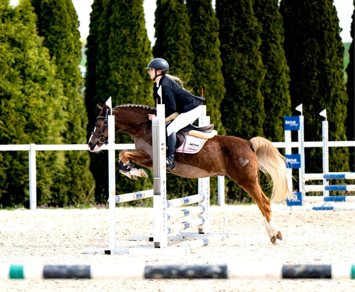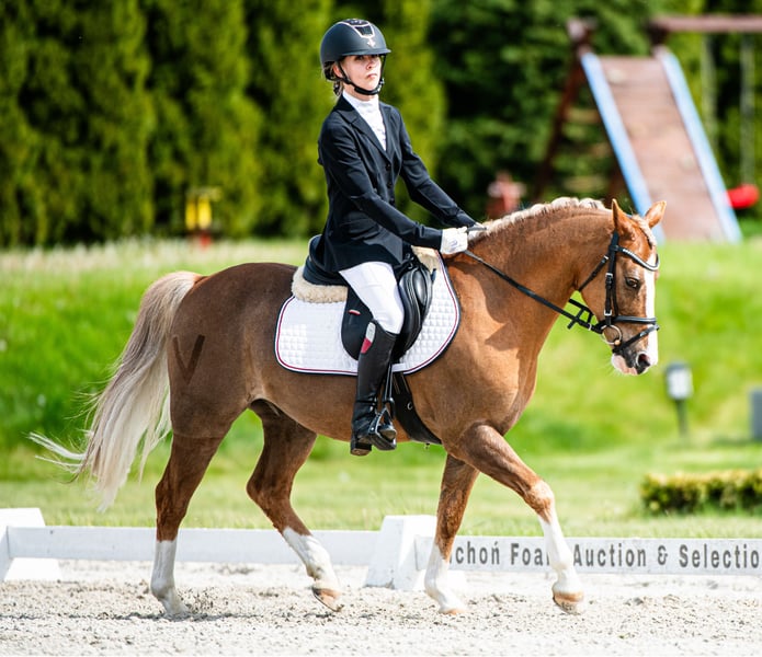Kuc Vossie. Stockmaß 134 cm. Nicht für Anfänger geeignet. Geht allein ins Gelände. Auf der Weide in der Herde. Läuft in der Longe. Springwettbewerbe auf 80 cm Niveau mit der Möglichkeit auf mehr. Dressurwettbewerbe auf Niveau L, vorbereitet für die Klasse P. Aktueller TUV liegt nicht vor.