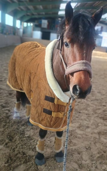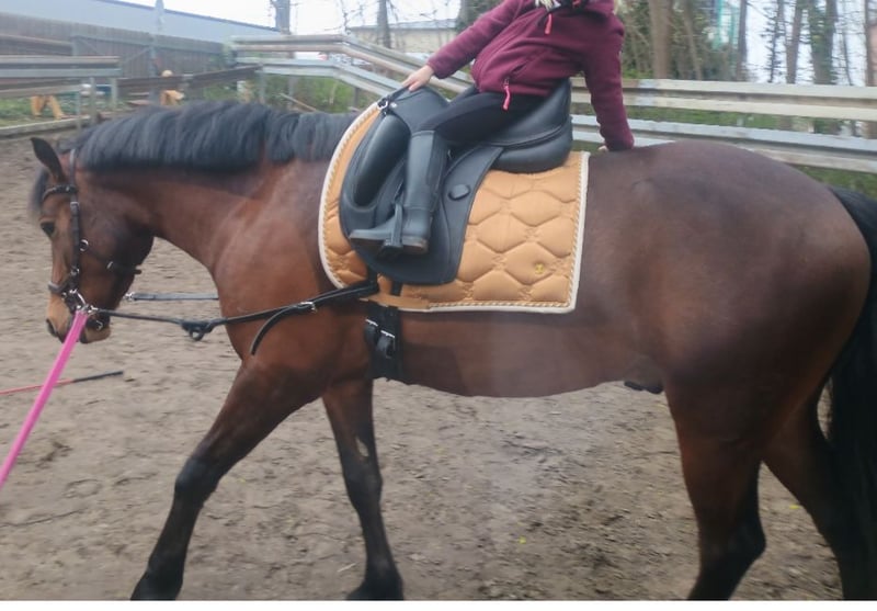 Unser Welsh Pony hat nun die Grundkenntnisse eines Reitpferdes erlernt und ist bereit für die weitere Ausbildung mit seinem passenden Reiter:in. Er ist ca 1,45 cm gross, von kräftiger Statur und im Umgang mit anderen Pferden recht selbstbewusst. Er geht lieb alleine ins Gelände und hat auf dem Turnier seine ersten Runden im Parcours mit Bravours gemeistert. Aufgrund eines Zungenfehlers, der ihn aber nicht beim reiten einschränkt, deutlich unter Wert abzugeben. Die Zunge lässt er, mal mehr und manchmal weniger bis gar nicht,links ein Stück raus gucken. Nach der vollständigen Zahnbildung kann das wieder besser werden, weiß man aber natürlich nicht. Einschränkungen beim Fressen etc hat er dadurch nicht. Bevorzugt Mutter-Kind Gespann, da er aufgrund seines Alters noch nicht als reines Kinderpony abgeben wird, da eine weitere Ausbildung notwendig ist.