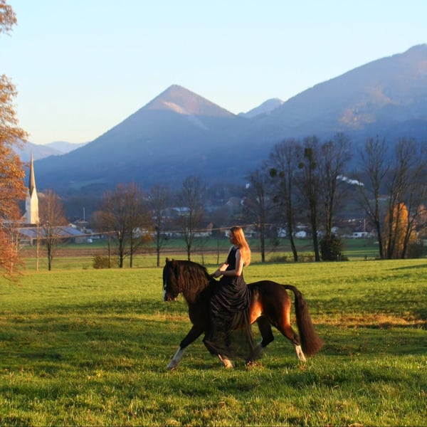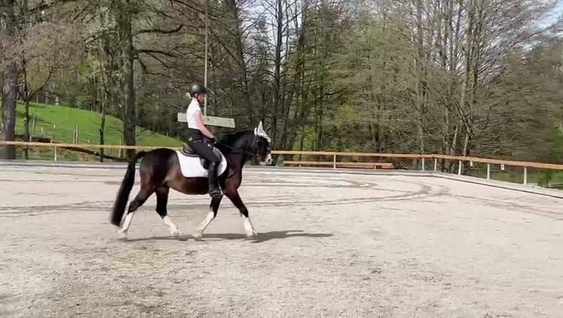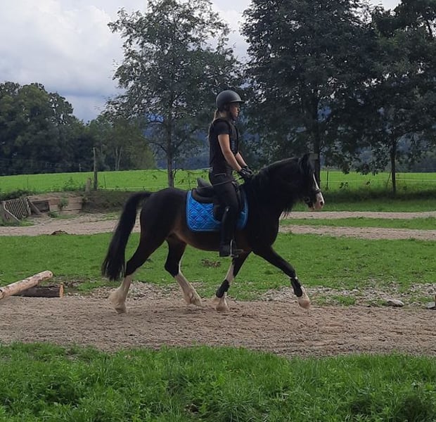 Welsh Cob Section C, stallion, 18 years old, black-brown with four white socks, 1.34m height at the withers. Suitability: Dressage - Cross-country - Jumping - Breeding On behalf of the client: Lord William… …immediately catches the eye of his viewers with his incomparable presence and chic, embodying the perfect original type of the Welsh C pony. He is bred from old English, established bloodlines, which is reflected in his entire appearance. An incredibly typy pony stallion, he was licensed in England under the name "Three-B William." He is equipped with above-average basic gaits and has a very fine, attentive temperament. Lord William is solidly trained and is easily ridden in the basic gaits by youths and small adults. His quick responsiveness and trust make daily work with him a true pleasure. Under saddle and on the ground, he has been trained in classical dressage basics, thus responding well to aids, joyfully jumps the cross-country course, and enjoys going out on trail rides. He has already participated in several courses at the stable, fulfilling the wishes of many young riders, such as passing a riding badge. Additionally, he is familiar with typical stable activities like children, dogs, and other horses coming and going, and riding in the arena with other horses; he remains very relaxed in all situations. With this miniature prince, you will attract all eyes! To us, he is a "light being" and is characterized by his soulful nature, which exhibits human-like traits. Only those who are receptive will understand him. Lord William has unmistakably left his "stamp" on all his previous foals, recognizable by their markings, beautiful heads, expression, and fabulous character. His offspring in various age groups can be seen on site. Of course, he has been regularly dewormed, osteopathically checked, and presented to the farrier (barefoot). He is socialized and has previously been kept with a gelding. Currently, he lives in a paddock and only lightly scratches himself in the summer. Location: DE - 83075 Au - Bad Feilnbach For more information and pictures, as well as contact, exclusively at: https://wow-pferd.de/horse/lord_william/ Mobile: +49 151 15227320