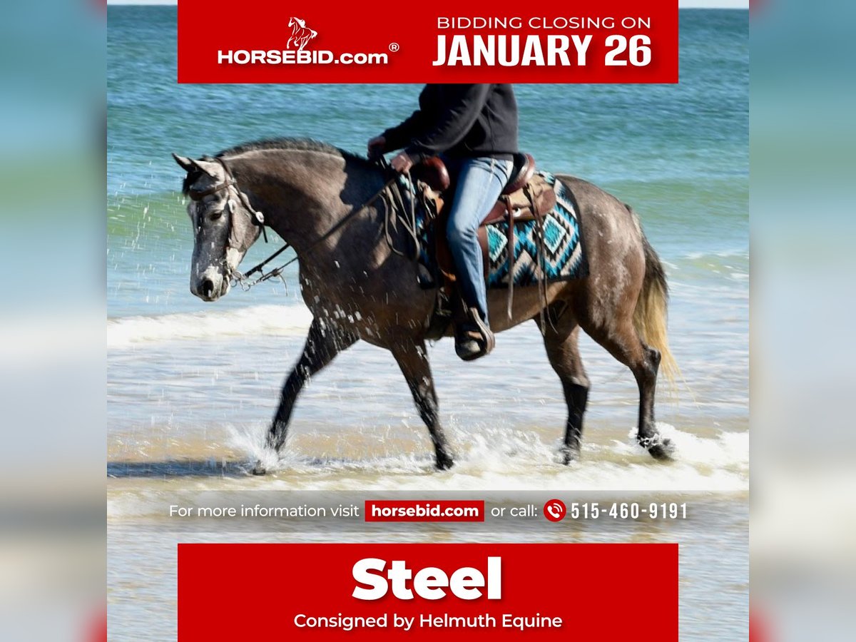 𝐉𝐀𝐍𝐔𝐀𝐑𝐘 ⭐️𝑨𝒍𝒍 𝑺𝒕𝒂𝒓 𝑳𝒊𝒏𝒆𝒖𝒑⭐️ Happening now thru MONDAY | JANUARY 26th - Available EXCLUSIVELY on HorseBid's website! For more details and to register visit: www.Horsebid.com CONSIGNOR CONTACT: Helmuth Equine 515-460-9191 LOCATION: Ames, IA BREED: Welsh/Quarter Pony Cross REGISTERED: No REGISTERED NAME: Steel COLOR: Gray HEIGHT: 13.2 AGE: 6 GENDER: Gelding Steel is an eye-catching Welsh Quarter Pony, broke to ride and well suited for the hunter/jumper ring, where he truly shines. He is a forward-thinking ride with no buck, rear, or bolt that enjoys his job and jumps with scope and enthusiasm, making him an excellent step-up pony for a rider ready to be competitive. This pony has a kind, willing personality and excellent ground manners. He is very sweet to handle and settles easily into new environments. He stands tied patiently anywhere, loads/unloads/hauls well in any type of trailer. He’s sound, up to date on all vaccinations/dental, and has great feet! Steel is an easy keeper, lives happily in a stall or turned out with any herd of horses. He has extensive off-property experience, having been ridden everywhere from snow drifts and trails in Iowa to the cross country courses and beaches of Florida, and takes new places confidently. Steel is an athletic pony that would also make a dependable working ranch pony and could easily excel in any discipline that requires stamina and a strong work ethic. He has been ridden English, western , bareback, double and is also broke to drive. He rides well in a snaffle bit on contact or a shanked bit on a loose rein. He has experience in all types of terrain down the trails. He is fun to ride anywhere as he is brave and confident down the trails. Ride him out alone or in a group of any size. He’s strong enough to carry most any size rider. He has the movement, brain, and jump to succeed in the hunter or jumper disciplines and would also be a fantastic Pony Club mount for a motivated rider. He turns heads wherever he goes with his beautiful dapple gray coat and polished presence.
